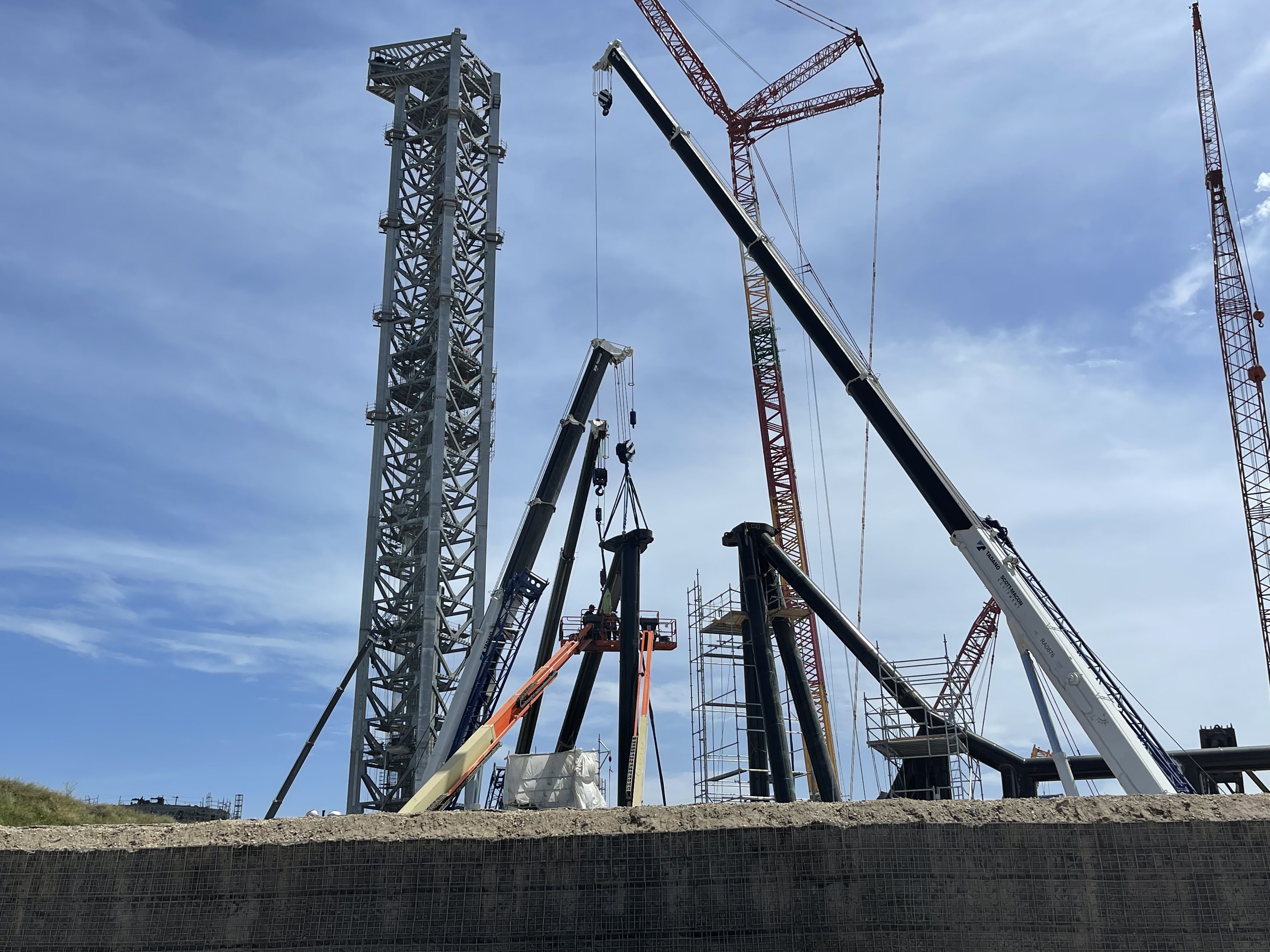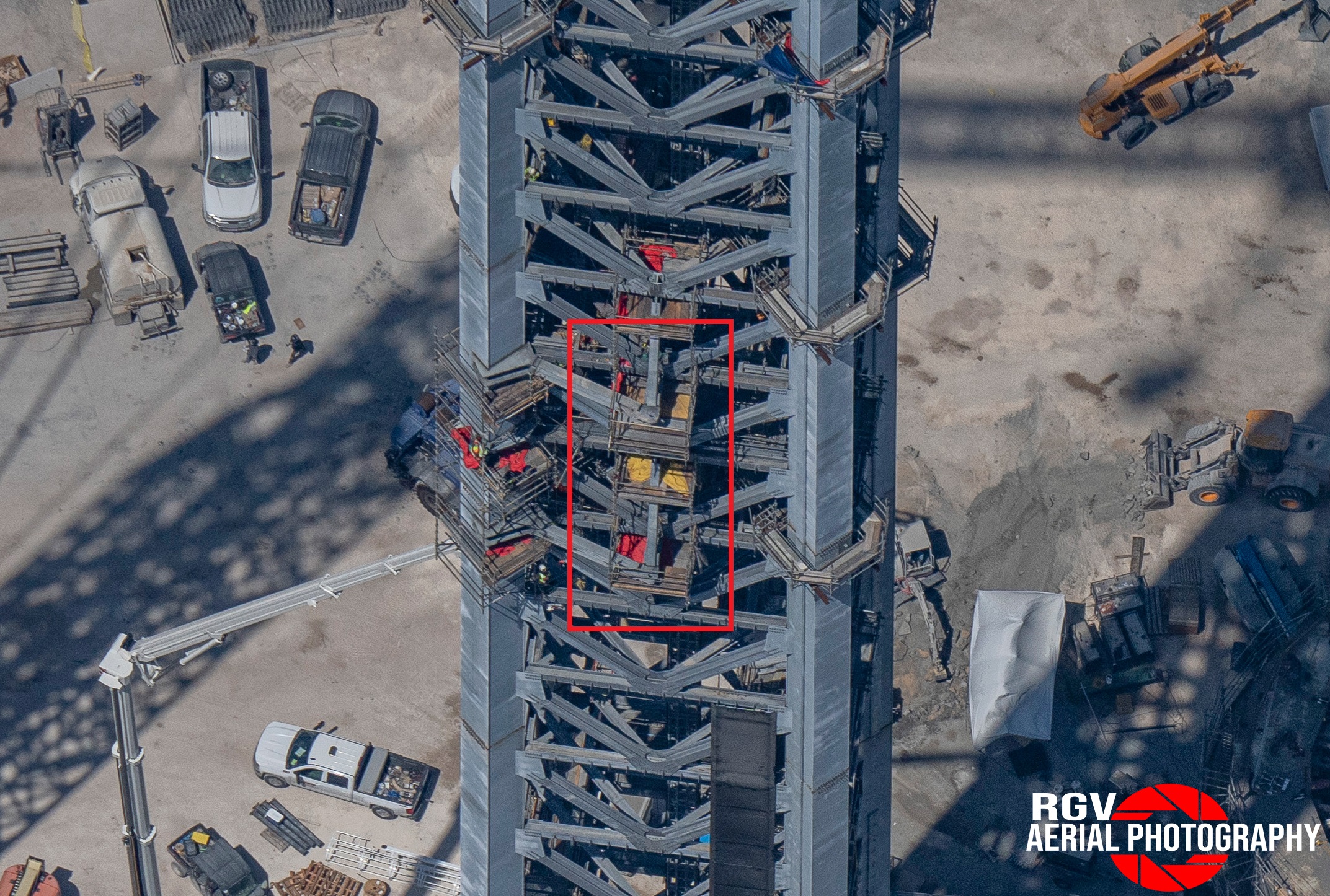 Илон сказал, что этот новый высокий пролет будет «только немного выше, но гораздо больше основания и двух козловых кранов, которые будут работать на полный пролет». Высокие отсеки используются для строительства 50-метровых звездолетов и 70-метровых сверхтяжелых ускорителей. Затем эти массивные транспортные средства транспортируются примерно на милю вниз по дороге, где они складываются вместе на стартовой площадке .