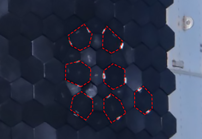 Антенны на левой стороне#Starship S20 уже полностью покрыт TPS. Остается вопрос: что отличает пластины, закрывающие антенны, разными, поскольку SpaceX позаботилась о том, чтобы заполнить геометрию вокруг них пластинами меньшего размера.