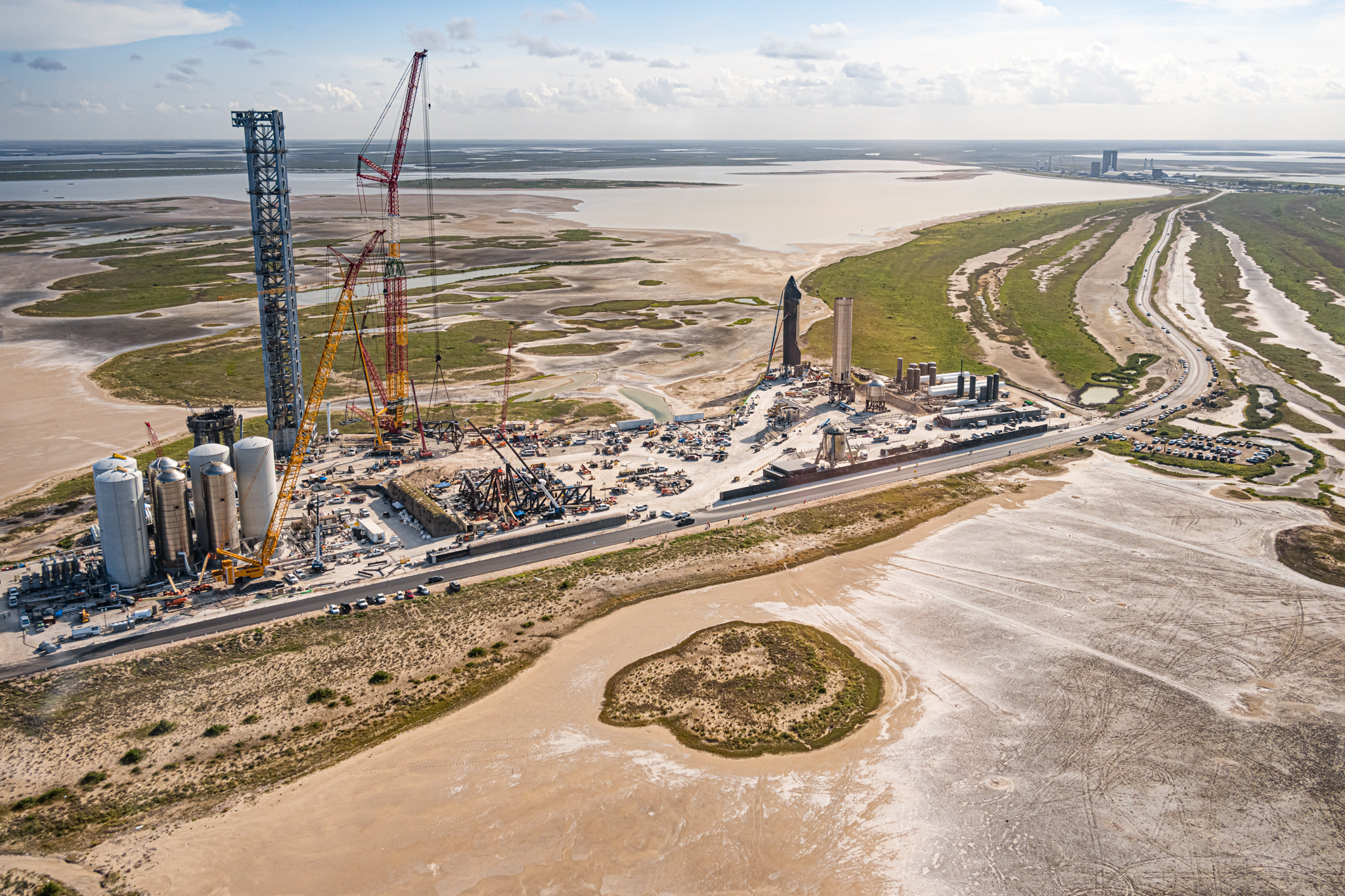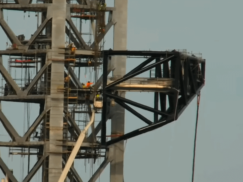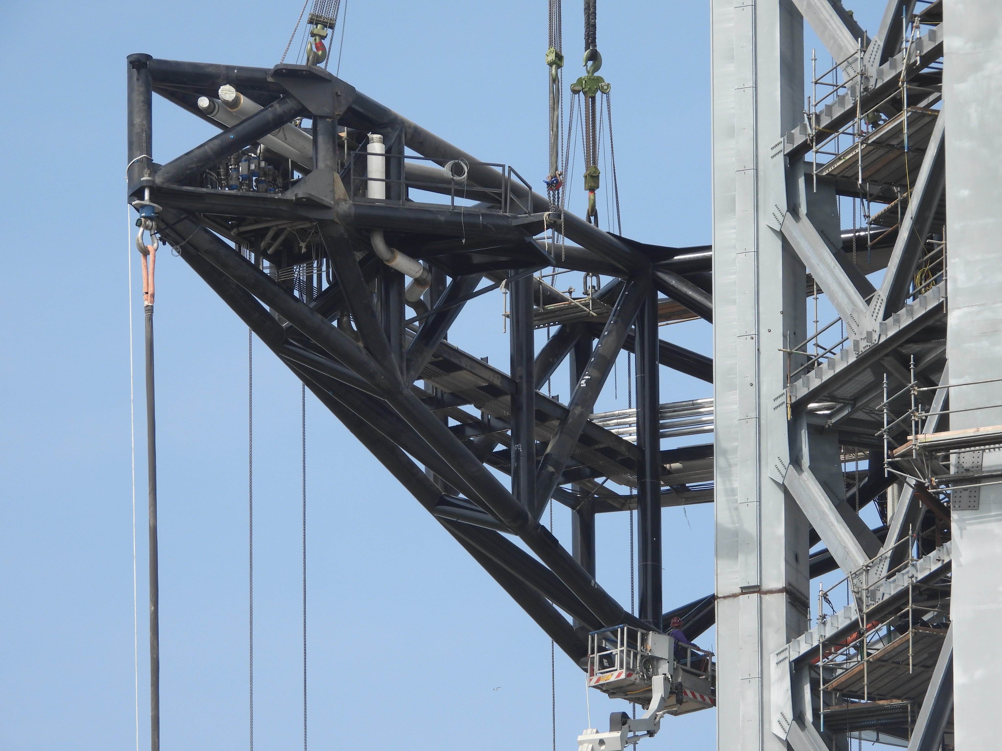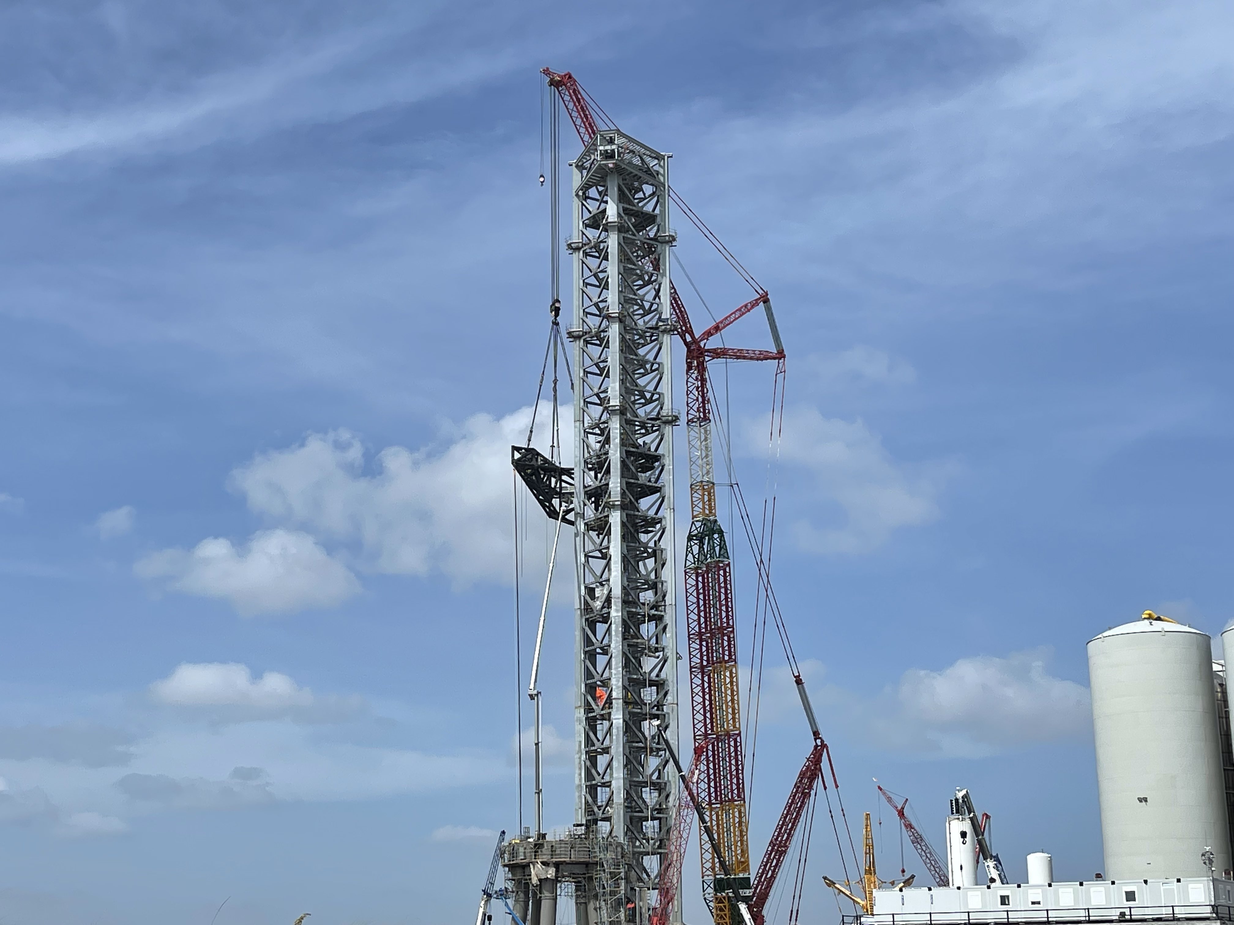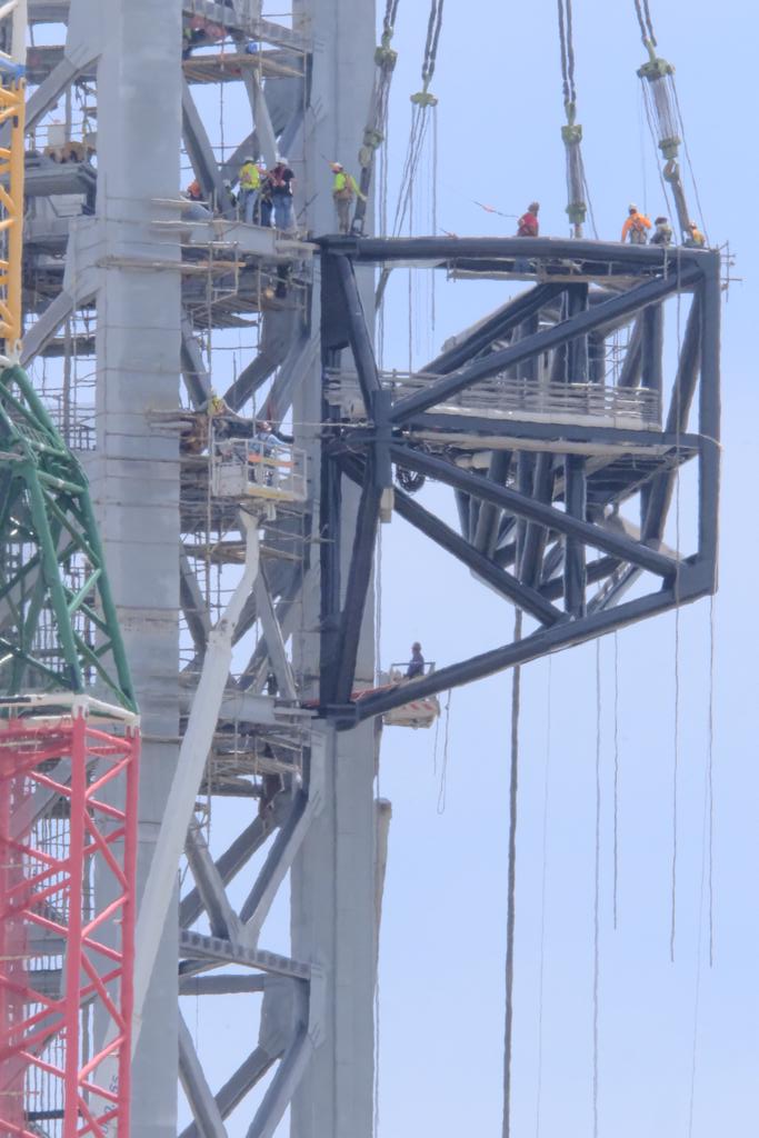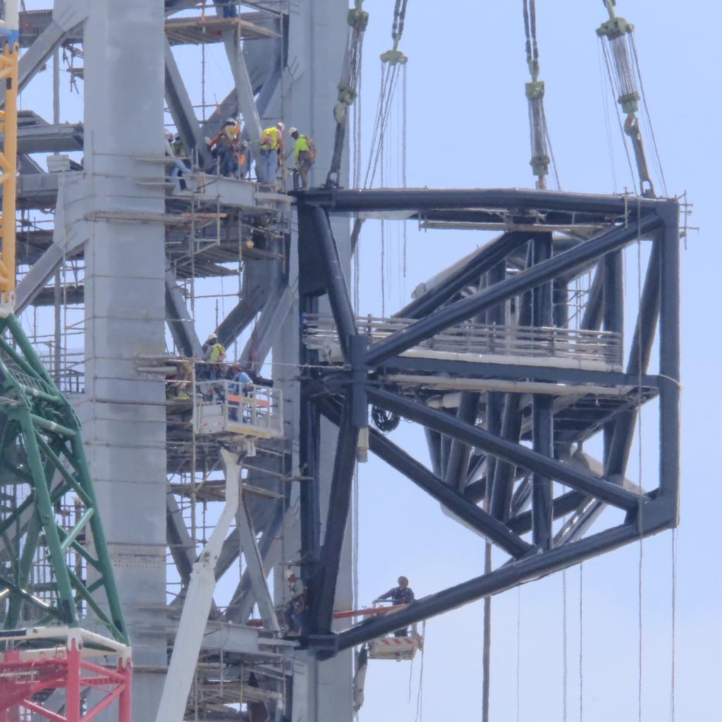 Памятуя Фалькон-9 можно предполагать, что бустер будет расти в высоту, хотя и не так далеко, как Фалькон. Во вторых, в новом ангаре будут два мостовых крана, работающие на всей площади ангара - а мостовой кран на 200 тонн весьма "толстая" железяка, хотя издалека смотрится ажурным. Ну, и, наконец, Маск в твиттере писал, что бустер в нынешнем ангаре не поместился, и пришлось убрать одно кольцо половинной высоты.