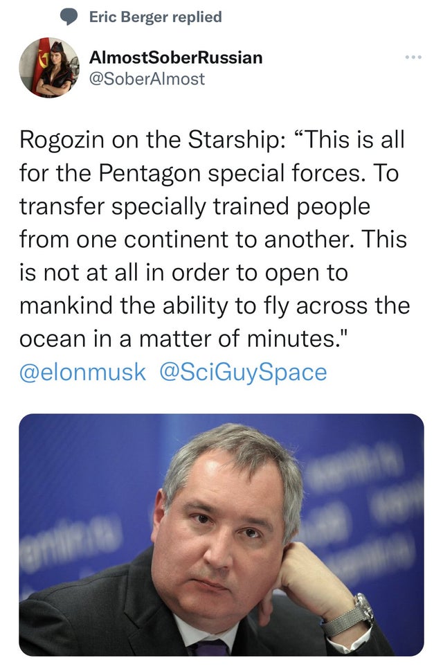 Способ узнать, что он даже не верит в то, что он говорит, заключается в том, что Роскосмос не показывает рендеры своего собственного звездолета в стиле 1990 года, которые будут введены в эксплуатацию в течение десятилетия (как это будет в следующем десятилетии, а также в следующем десятилетии, и наверное, и через десять лет после этого)
