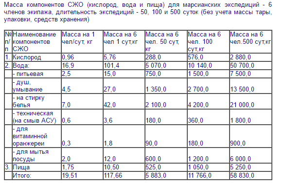 регулярно бываю в легкоходных походах 7-12 дней, раскладка минимум - сухой заранее подготовленной сбалансированной еды без излишеств 450гр/сутки на человека, максимум, когда даже остается - 600гр/на человека, это с майонезом, печеньем, сахаром, чаем и вкусняшками. Воды 3 литра в сутки на человека, включая умыться перед сном и почистить зубы (100гр вечернего чаю), да, нужно предусмотреть регенерацию технической воды, но на сколько я знаю на МКС пьют свежую воду, а регенеративная идет в Электрон на кислород и тех нужды. Итого 600гр на человека или 300кг еды на человека на 500дней. Воды 1.5тонны, это если не употреблять регенеративную. Итого менее 2т на человека на 500дней полета.