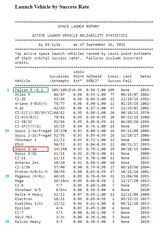 Я не смог найти нужную ссылку, но на втором месте китайская ракета, причем насколько я помню, даже если у F-9 случится авария, он все равно будет на первом месте.