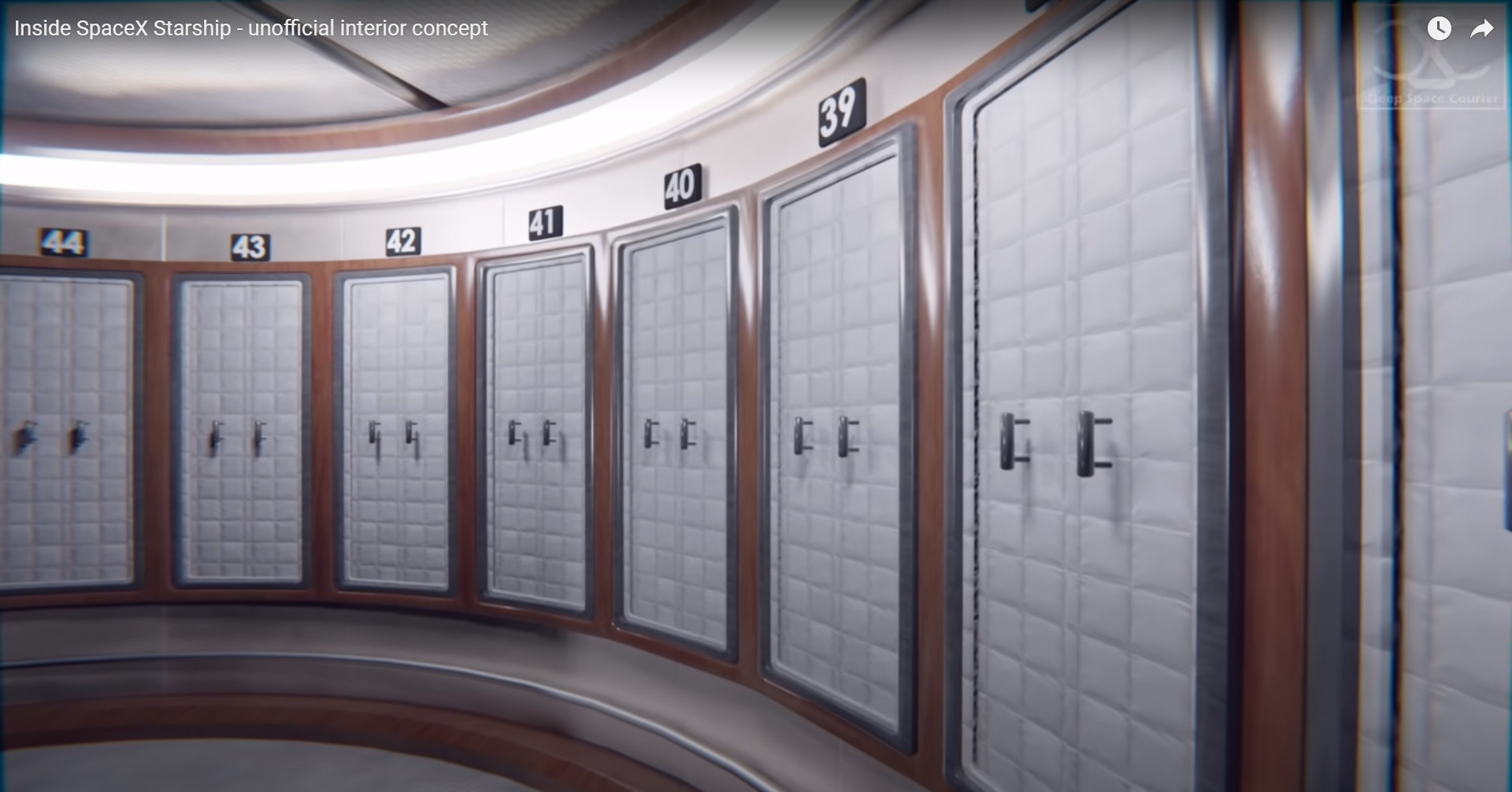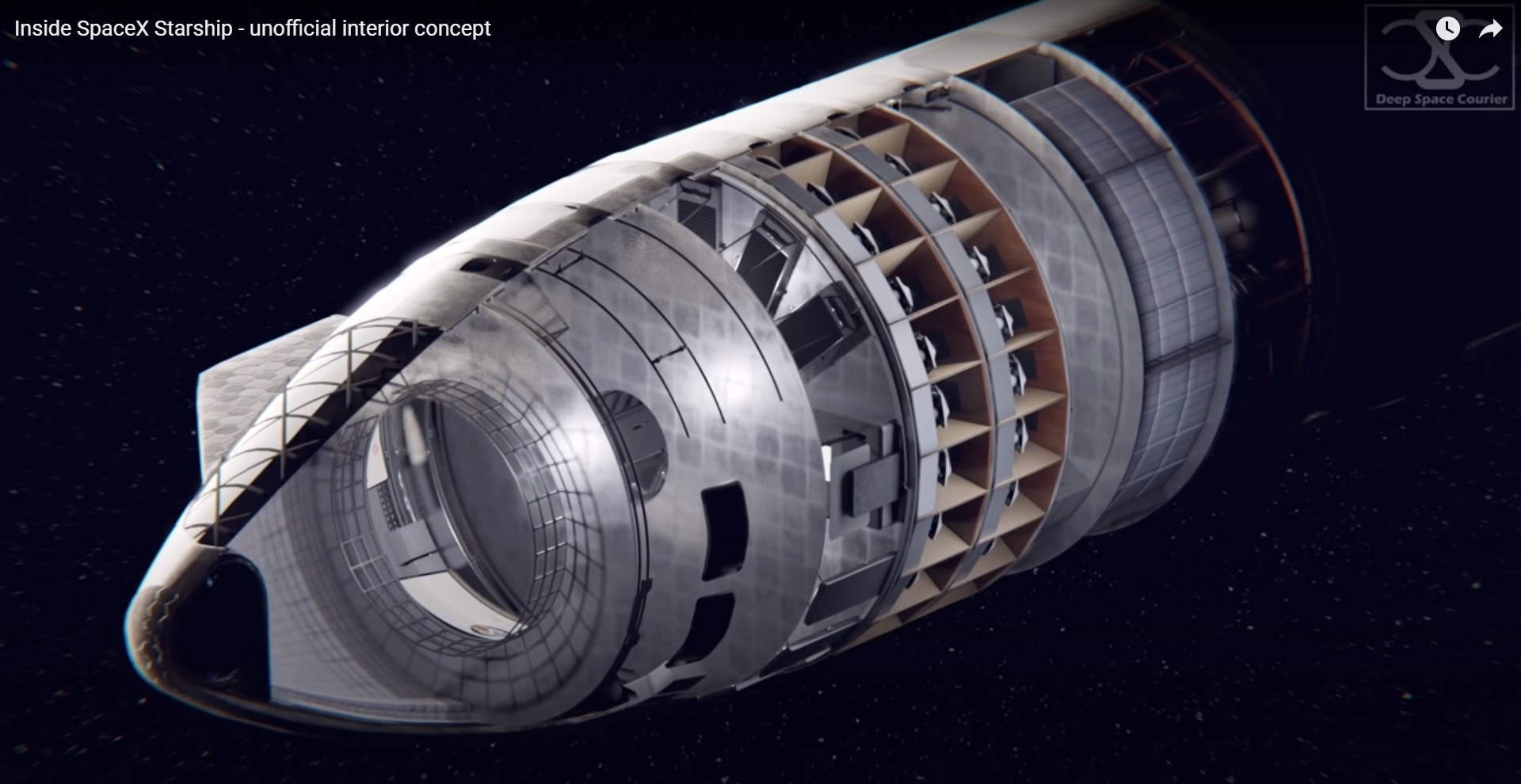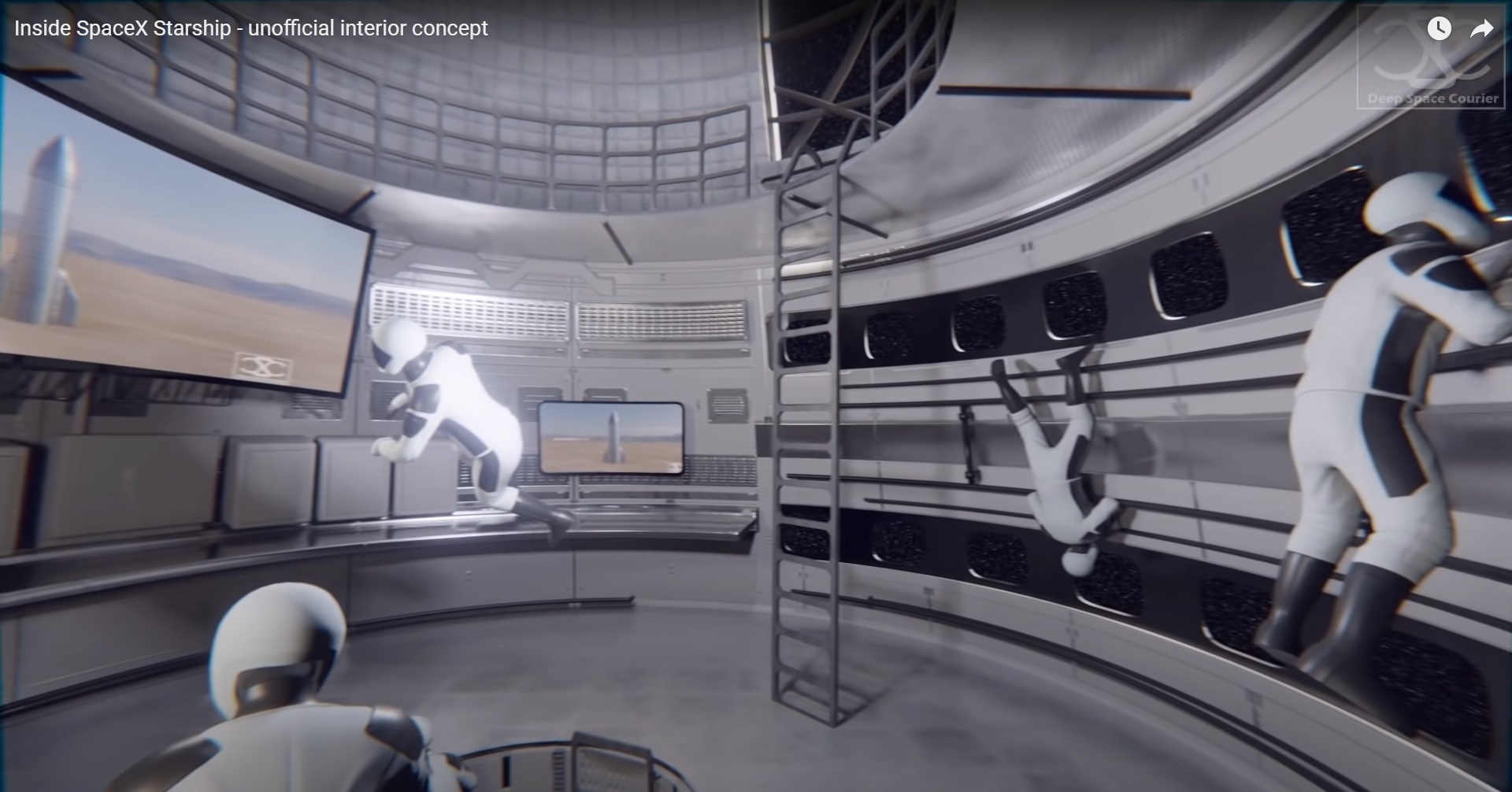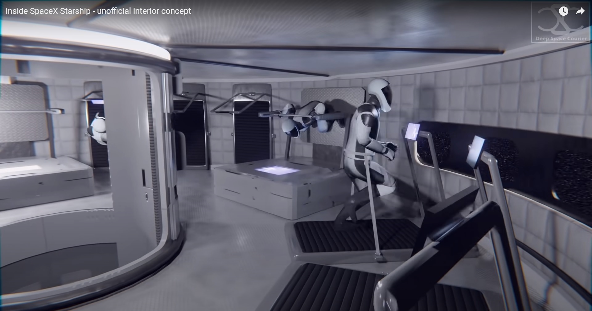 Общее помещение представляет собой большой зал с полноразмерным окном в носовой части обтекателя и маленькими обзорными иллюминаторами, расположенными по периметру общей комнаты, через которые экипаж сможет наблюдать за космическим пространством за бортом Starship. Под общим залом располагается гимназий – спортивный зал с различными тренажерами, в основном беговыми дорожками, чтобы экипаж во время полета мог поддерживать приемлемую физическую форму. На уровне ниже находятся личные каюты (кабины) экипажа. Маск упоминал о 40 помещениях, в каждом из которых будут жить по два-три человека, но есть и альтернативный вариант размещения, предполагающий наличие 50 изолированных индивидуальных отсеков. В собственной крохотной комнате участник экспедиции может либо лежать, либо сидеть – кровать легко трансформируется в кресло и обратно. Каждая каюта оборудована компьютером, с помощью которого можно смотреть видео, записывать и посылать своеобразные послания домой. Под жилыми помещениями располагается комната, где экипаж будет собираться в случае активных солнечных вспышек, о которых его заранее уведомит бортовой компьютер. Подобное помещение существует сегодня и на Международной космической станции. В этом же отсеке находятся уборные. Все отсеки соединяет вертикальная шахта с лестницами, с их помощью экипаж может плыть в невесомости, перемещаясь из одного уровня звездолета в другой. Под помещением с уборными – уровень негерметичного хранилища, аккумуляторы и другие служебные помещения, которые презентация SpaceX обходит стороной.