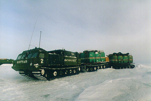 На первом фото сочлененный снегоболотоход "Витязь", это как раз вполне современная техника. Но гусеницы ограничивают ресурс, да и сам он, по отношению к собственной грузоподъёмности, очень тяжёлый, и требует большой мощности для движения. На второй - как раз ракетный тягач.