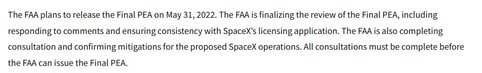 >>Apparently, this morning, the FAA site briefly said the Final PEA Decision on Boca Chica was being extended to May 31. But now the site has reverted to April 29.
