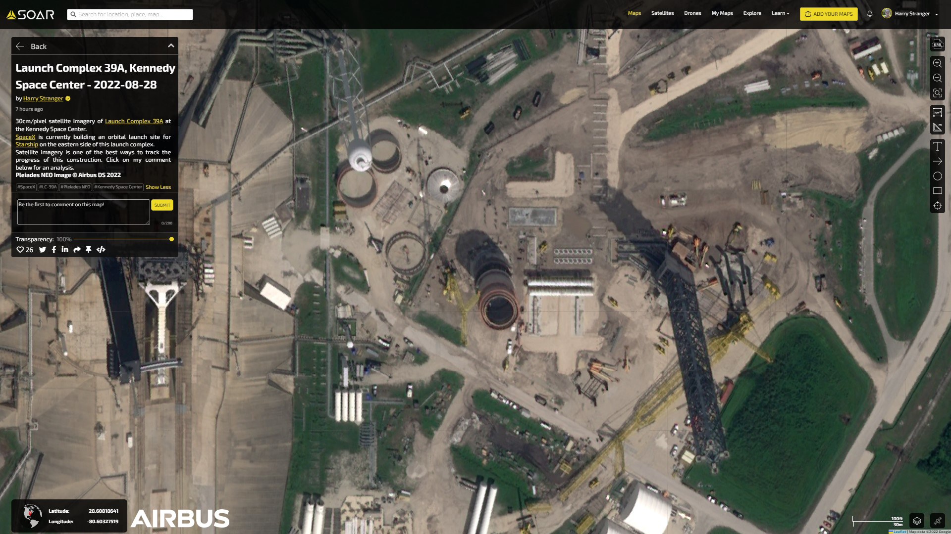 Спутниковые снимки 39A и прогресс в сборке нового криогенного резервуара (для жидкого метана?) между двумя стартовыми столами: