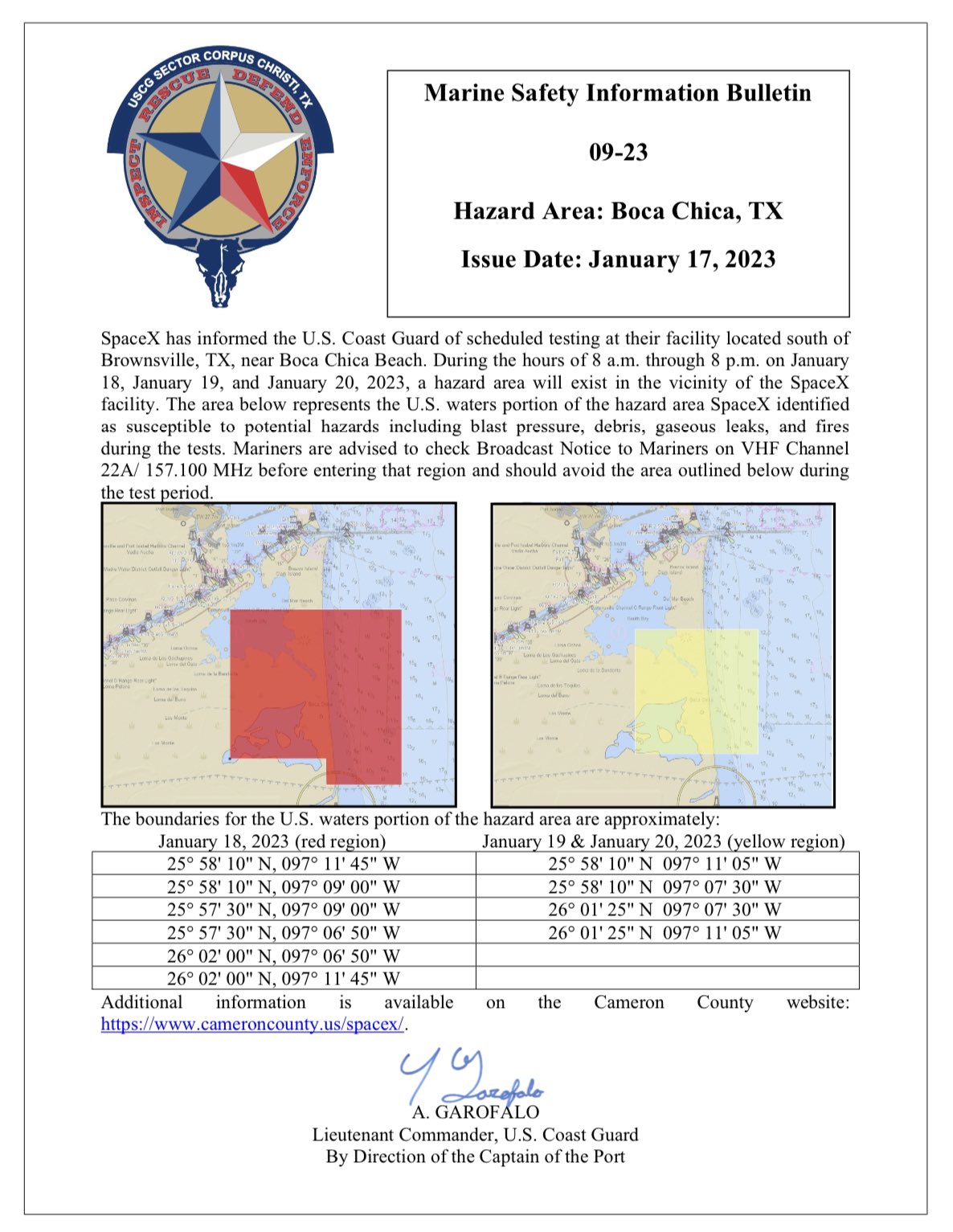 Цитата: Stimbergi от 18.01.2023 10:19:08Tomorrow's exclusion zone matches the same size and area as the last exclusion zone used during the January 13th partial propellant load test. If no cancellation, I would expect this to be the case.