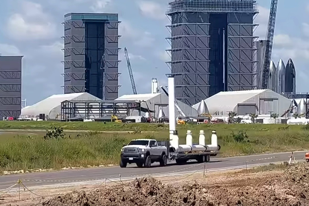 — На стартовую площадку в Starbase завозятся массивные элементы новой водяной системы. Строители заняты отсыпкой гранитным щебнем "подушки" под пусковой установ
