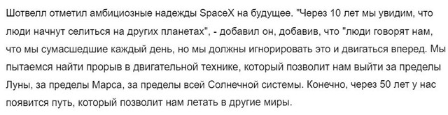 в нынешнем маске мне отвратна не его марсианская риторика, а ее контекст, трамповщина-реднековщина. соответственно я имею в виду контекст выступления шотвелл, акцентированный вами вскл знаками; это дает шансы на то что дело маска может перейти в надежные руки ; ).