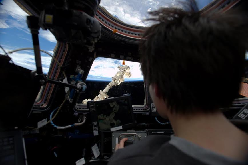 European Space Agency (ESA) astronaut Samantha Cristoforetti is pictured inside the multi-windowed cupola. She will be the lead Expedition 43 crew member for the CRS-6 capture and berthing operation. Photo Credit: Twitter @AstroSamantha