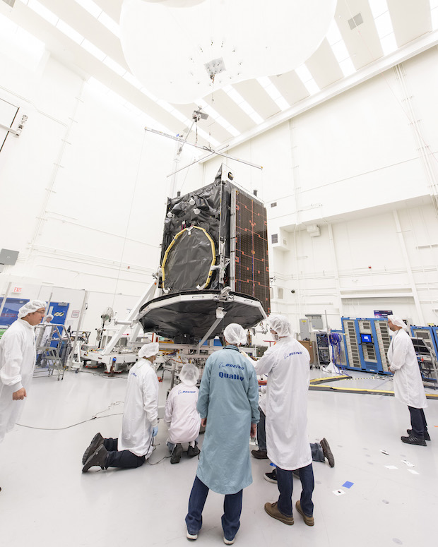 The SES 9 satellite, pictured here during manufacturing, carries chemical and electric propulsion systems. Credit: SES/Boeing