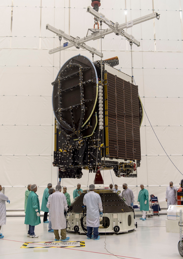 the Intelsat 34 co-passenger is shown being lowered for its initial fit-check with launcher hardware.