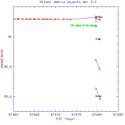 Две последних строки, вероятно, следует отнести на неточность определения элементов фрагментов после разрушения (либо -- как вариант -- они отделились не от Hitomi, а от второго крупного объекта). Остальные вполне прилично соответствуют заявленному СК США моменту разрушения 01:42 UTC.