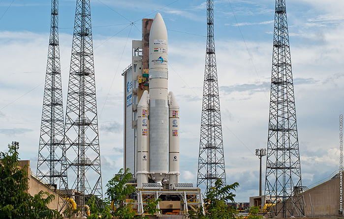 Arianespace's Ariane 5 is in the Spaceport's ELA-3 launch zone, ready for its dual-passenger flight with Arabsat-6B (BADR-7) and GSAT-15.
