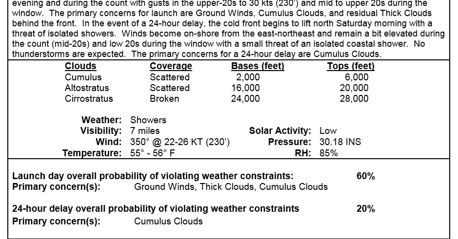 Weather forecast still 40% "go" for 8:38am Fri. launch of #Atlas V, #GPSIIF12 from Cape Canaveral AFS.