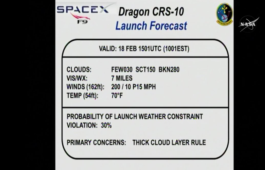 F9/CRS10: Liftoff is targeted for 10:01:32am EST; weather looks favorable, with high, thin cirrus, but no update yet from SpaceX or NASA