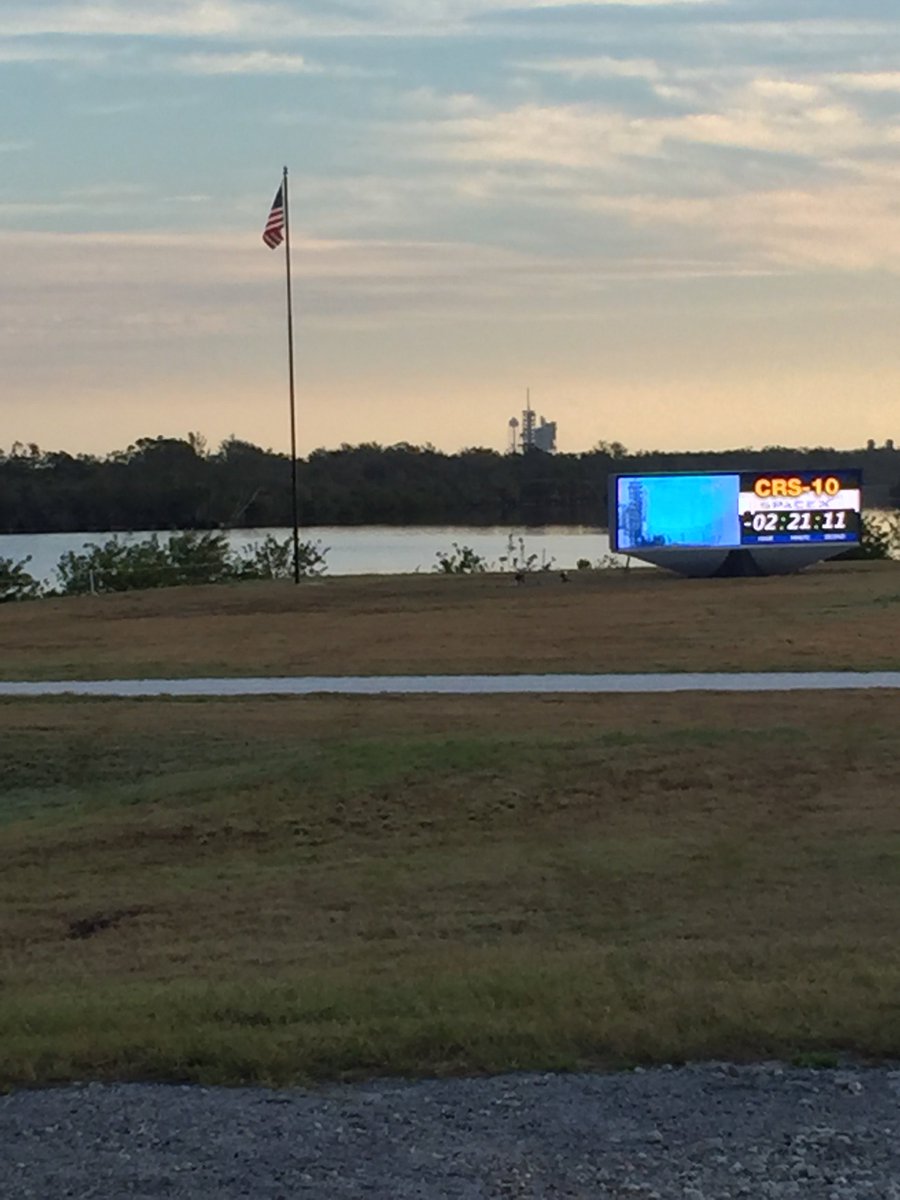 Dragon and top of Falcon 9 visible above the shuttle-era structures of LC-39A as seen from the KSC Press Site this morning.