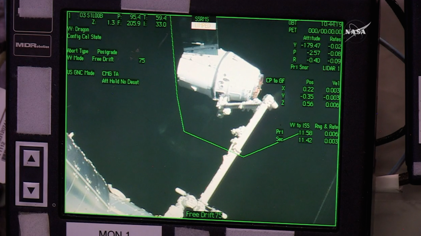 "Smooth as glass" as ISS grapples Dragon at 5:44 am EST, 16 minutes ahead of today's schedule but one day later than originally planned.