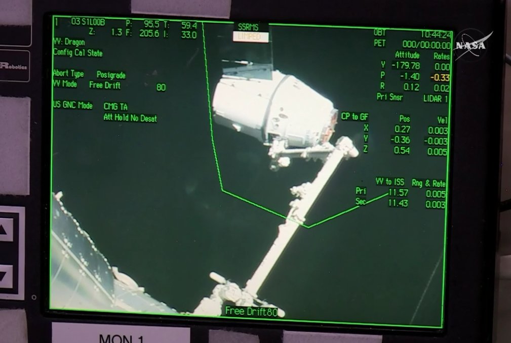 Capture confirmed. European Space Agency astronaut Thomas Pesquet grappled Dragon at 5:44 a.m. EST (1044 GMT) as the space station flew about about 250 miles up off the northwest coast of Australia.