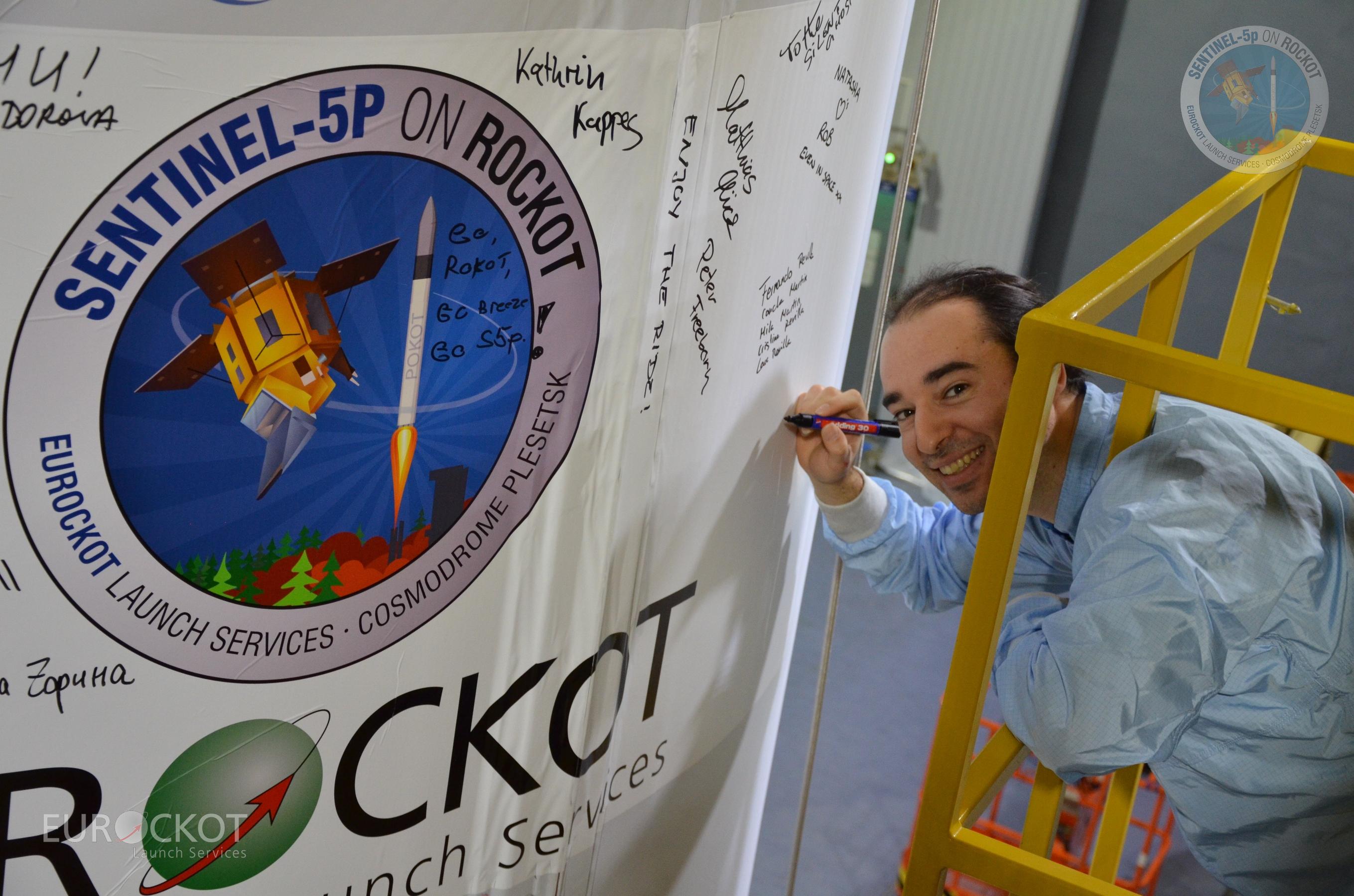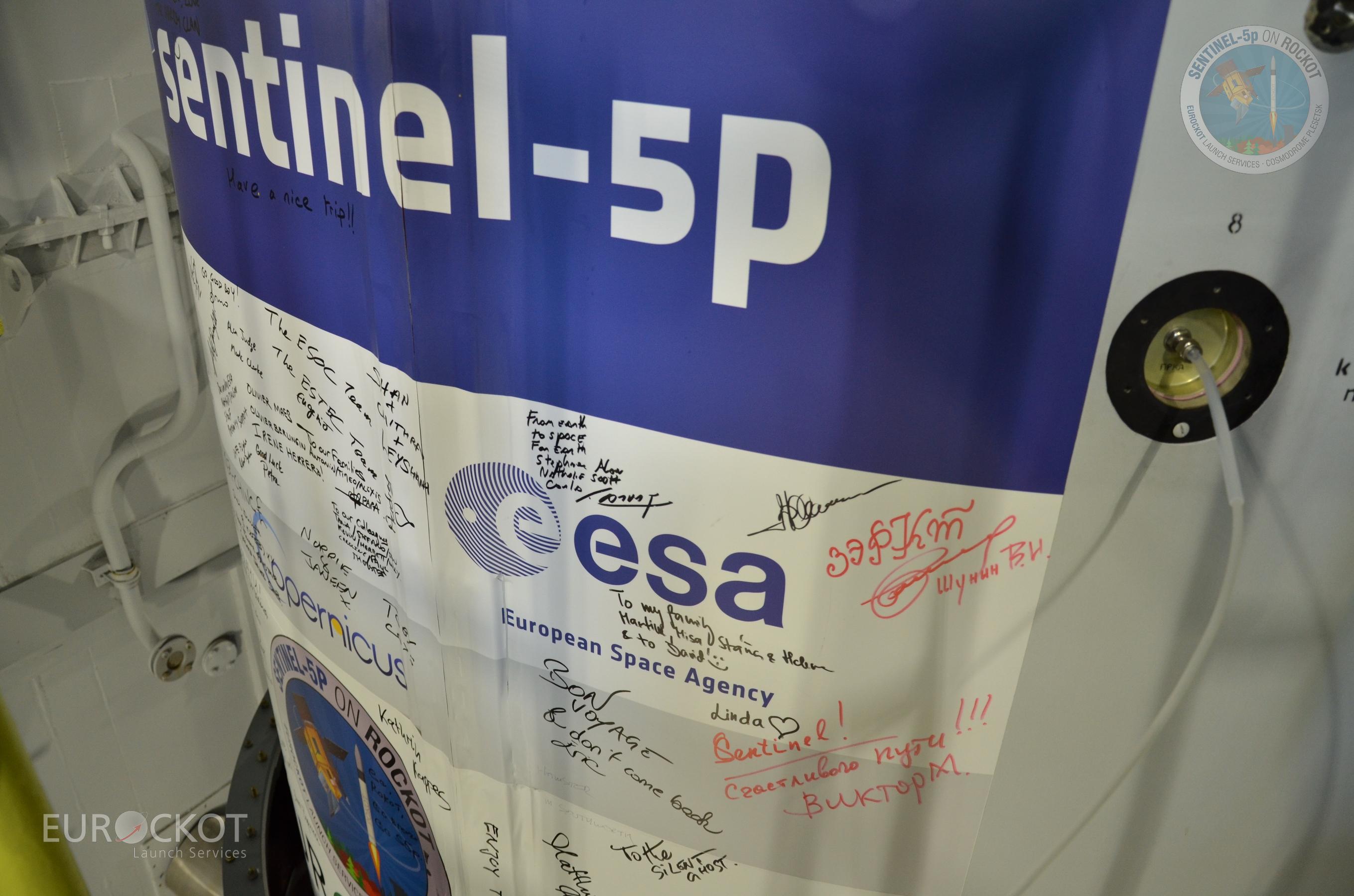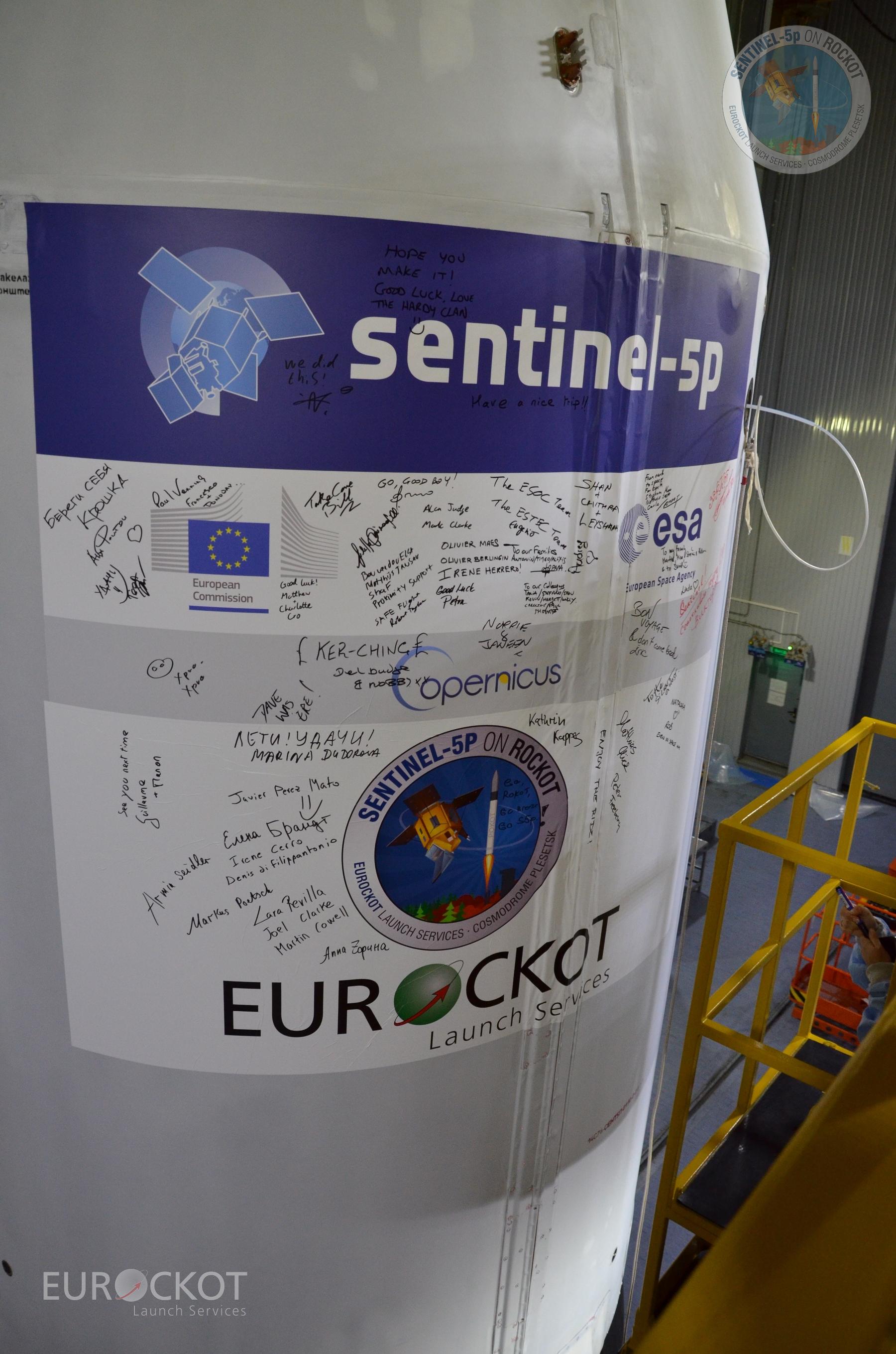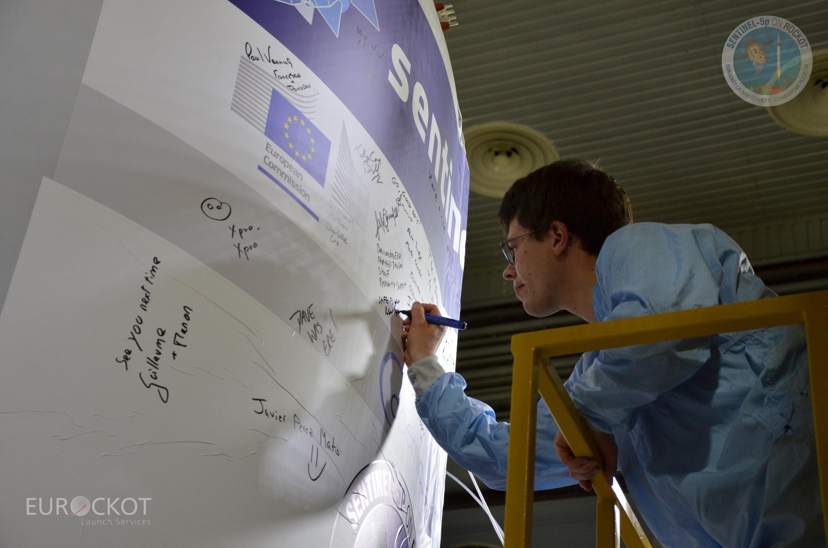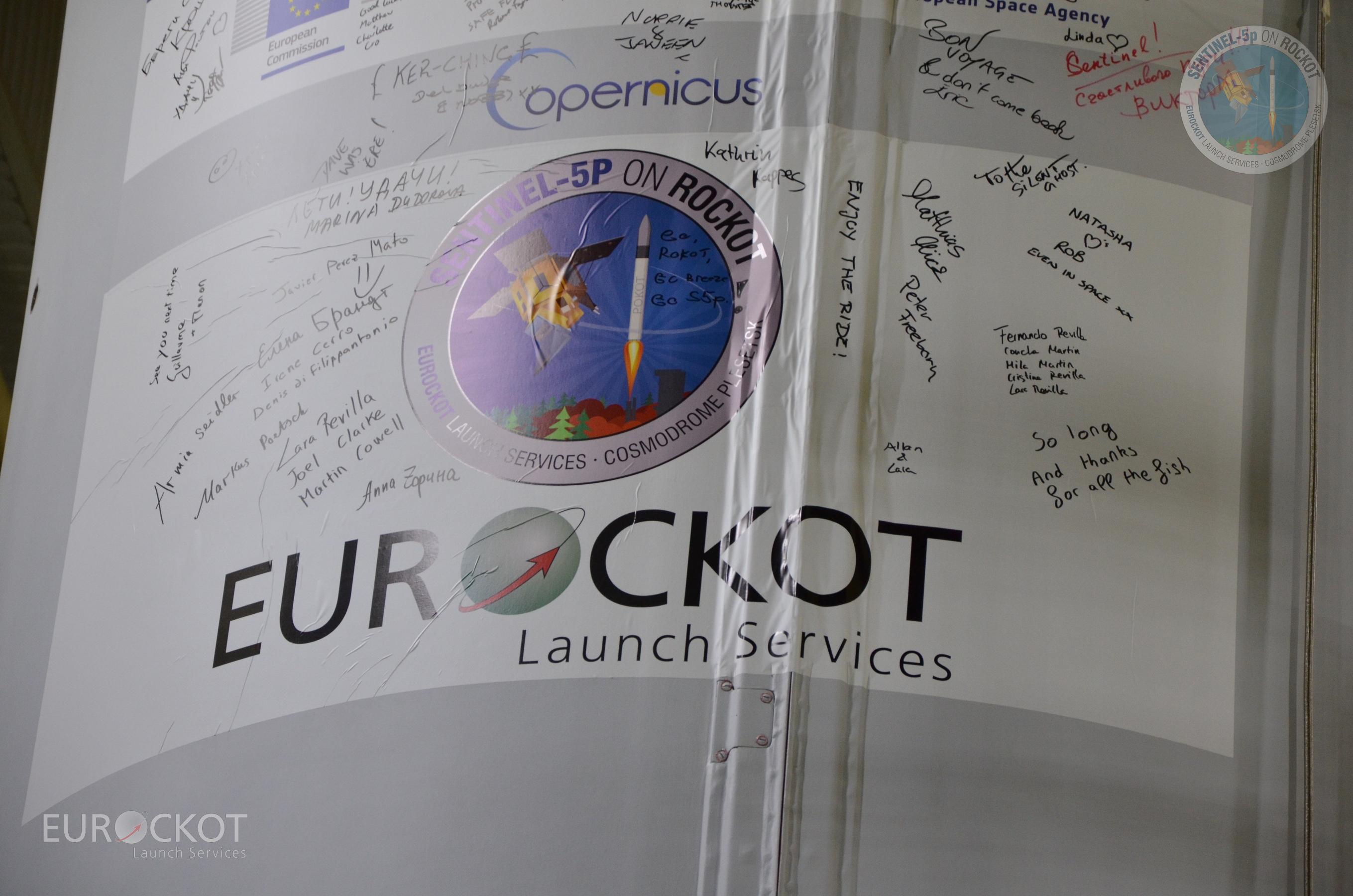 It is a nice tradition for Eurockot launches from the Plesetsk Cosmodrome: Once the payload fairing of the Rockot has been sealed, and after the mission logos have been attached, the entire launch campaign team gets the chance to sign their names on the rocket. Only eight days away from flight, the nose cone signing ceremony is a very emotional moment and many team members leave good wishes for mission success that will be carried into space. Sentinel-5p, enjoy the ride!