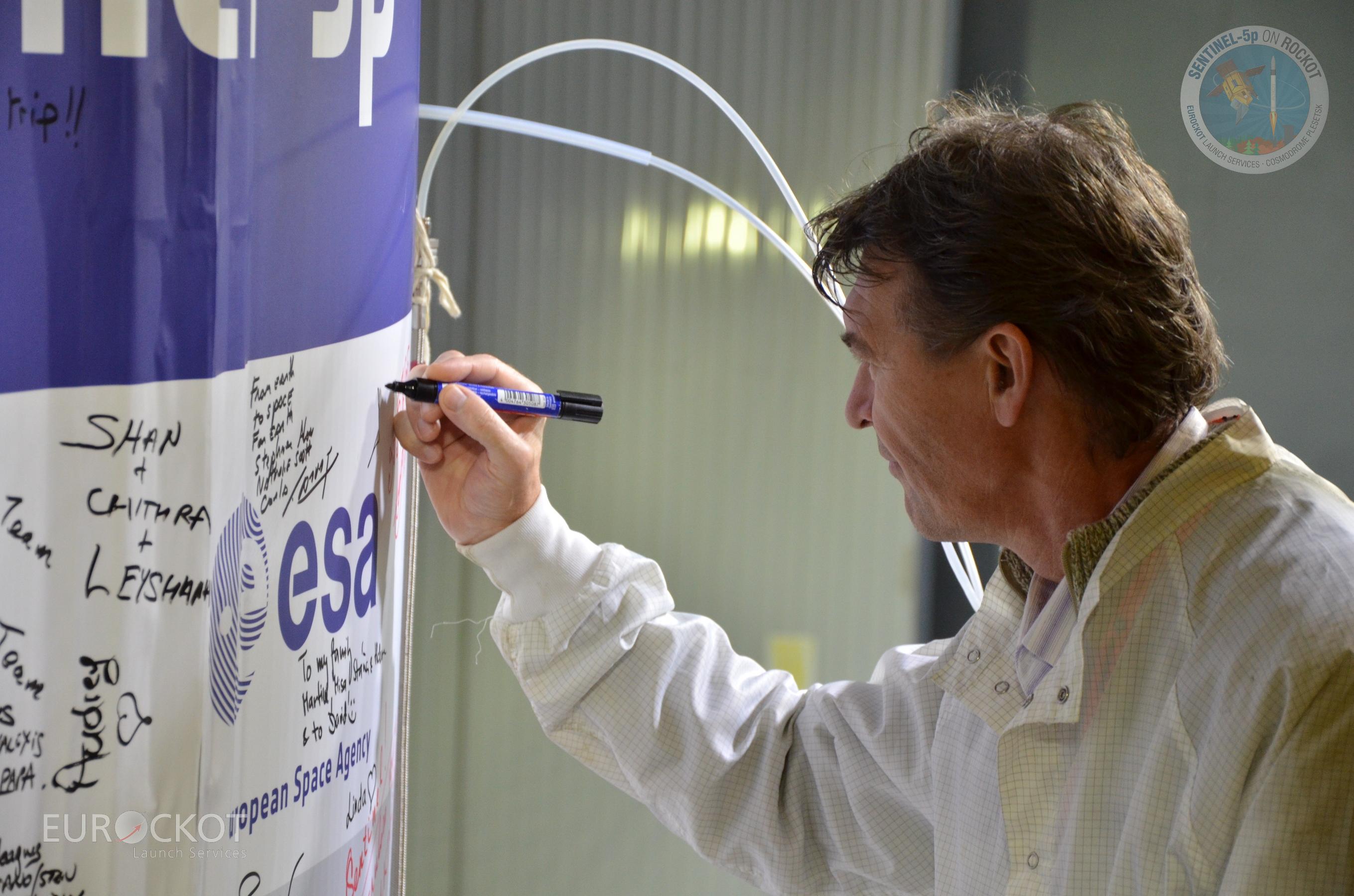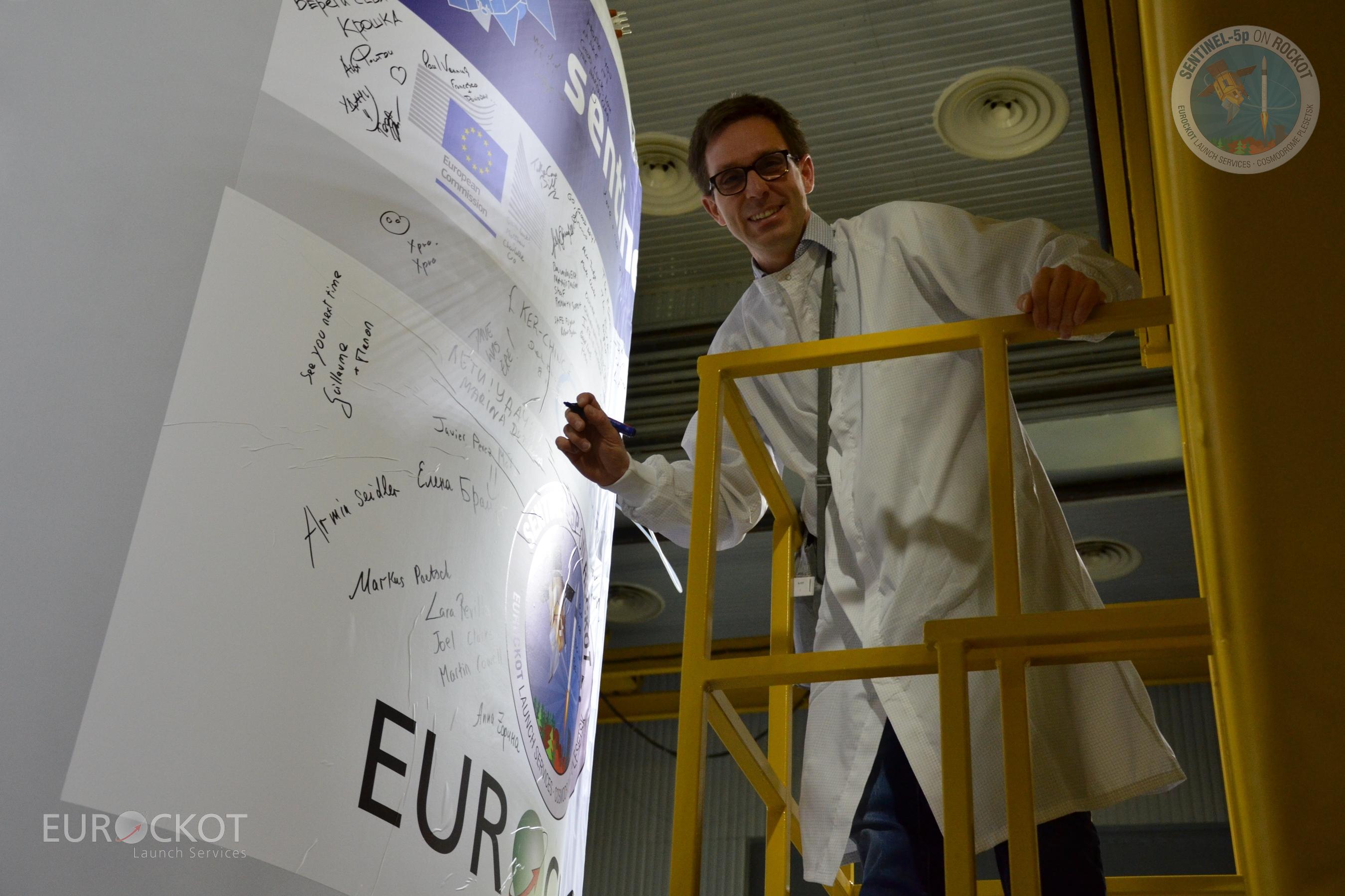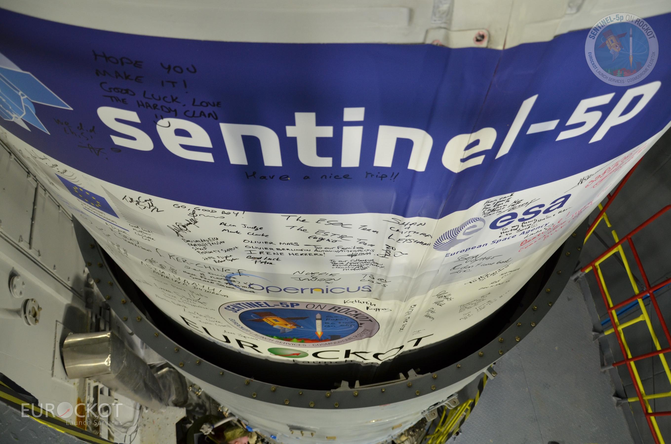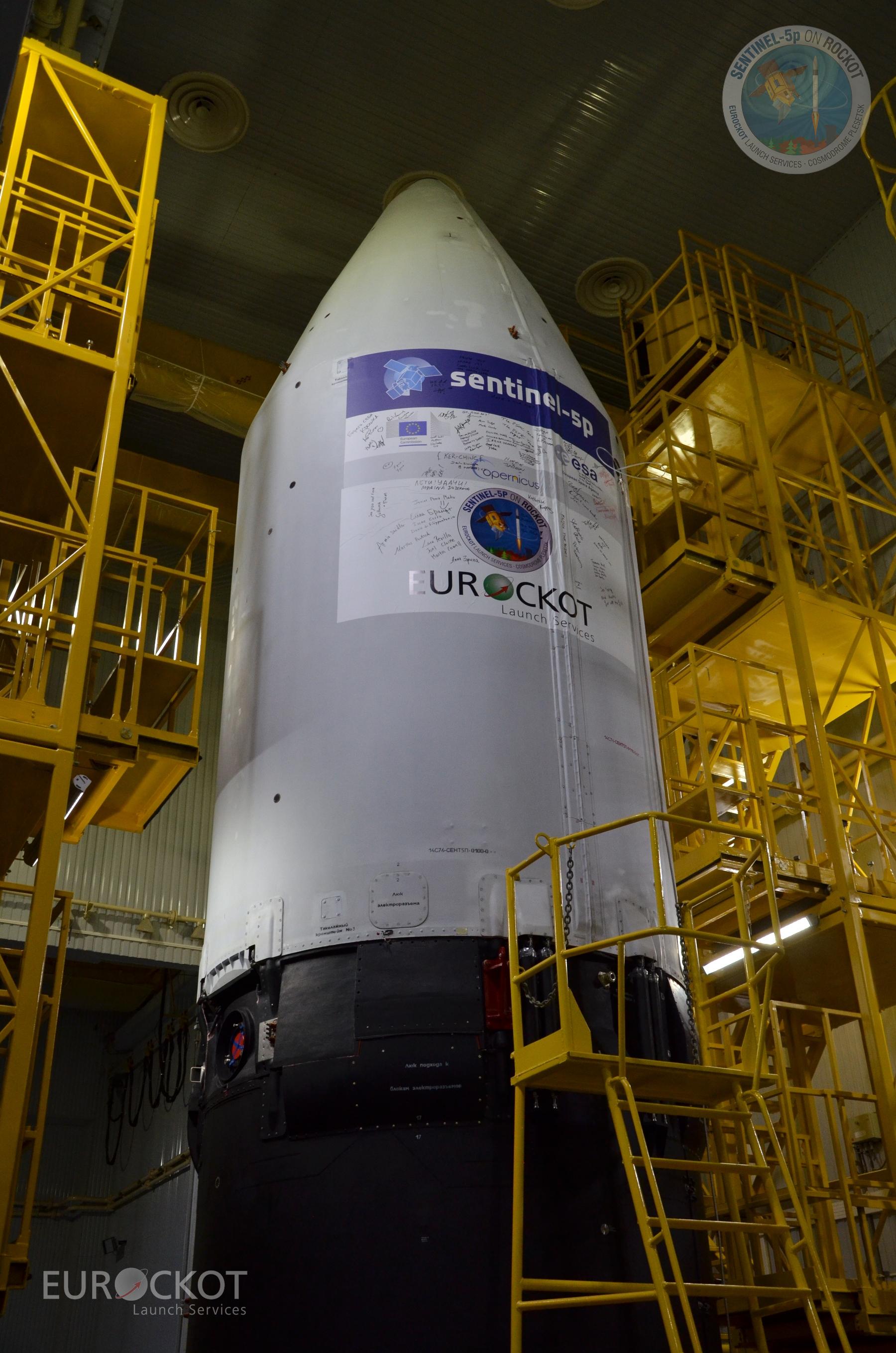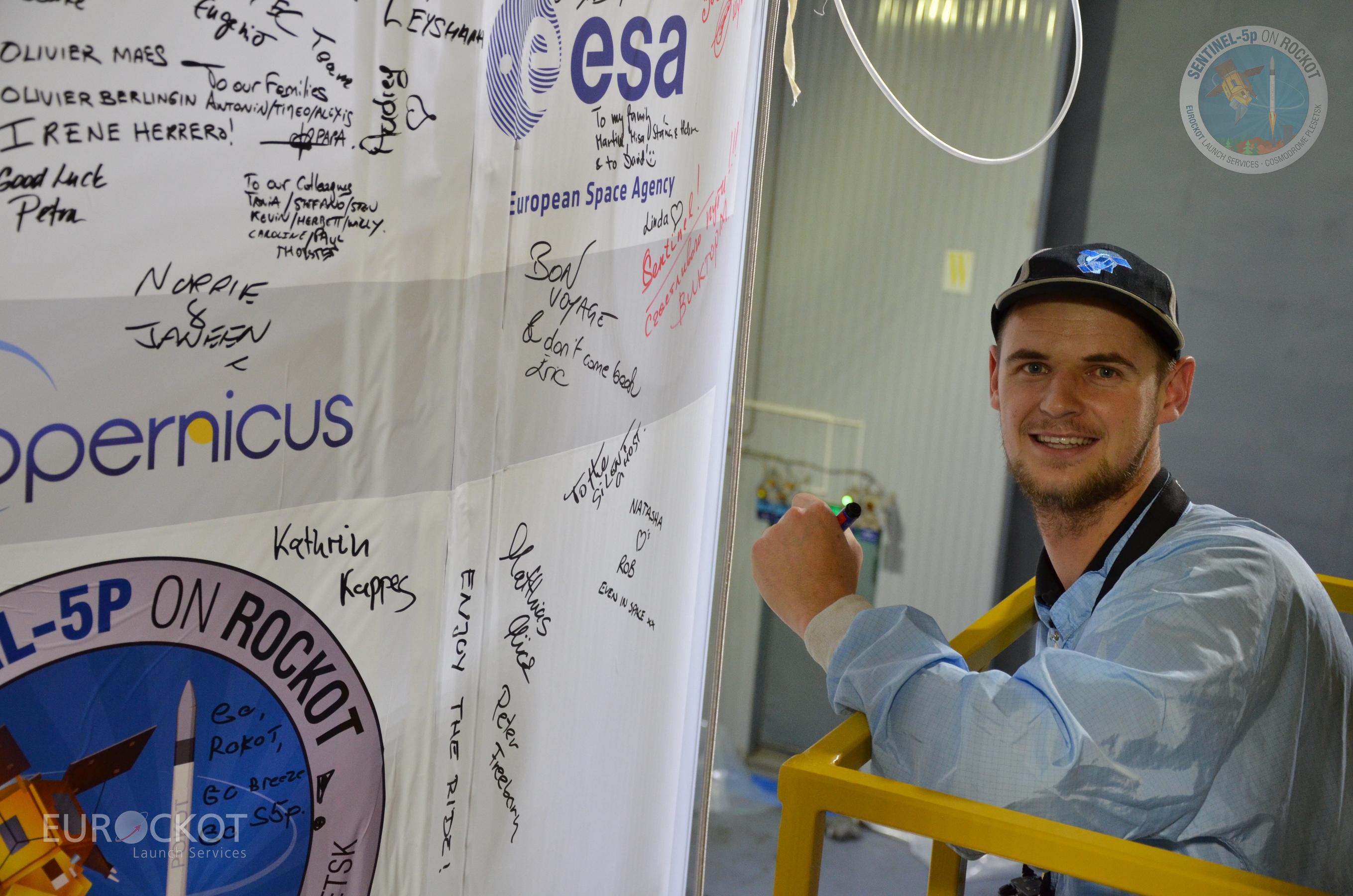 It is a nice tradition for Eurockot launches from the Plesetsk Cosmodrome: Once the payload fairing of the Rockot has been sealed, and after the mission logos have been attached, the entire launch campaign team gets the chance to sign their names on the rocket. Only eight days away from flight, the nose cone signing ceremony is a very emotional moment and many team members leave good wishes for mission success that will be carried into space. Sentinel-5p, enjoy the ride!