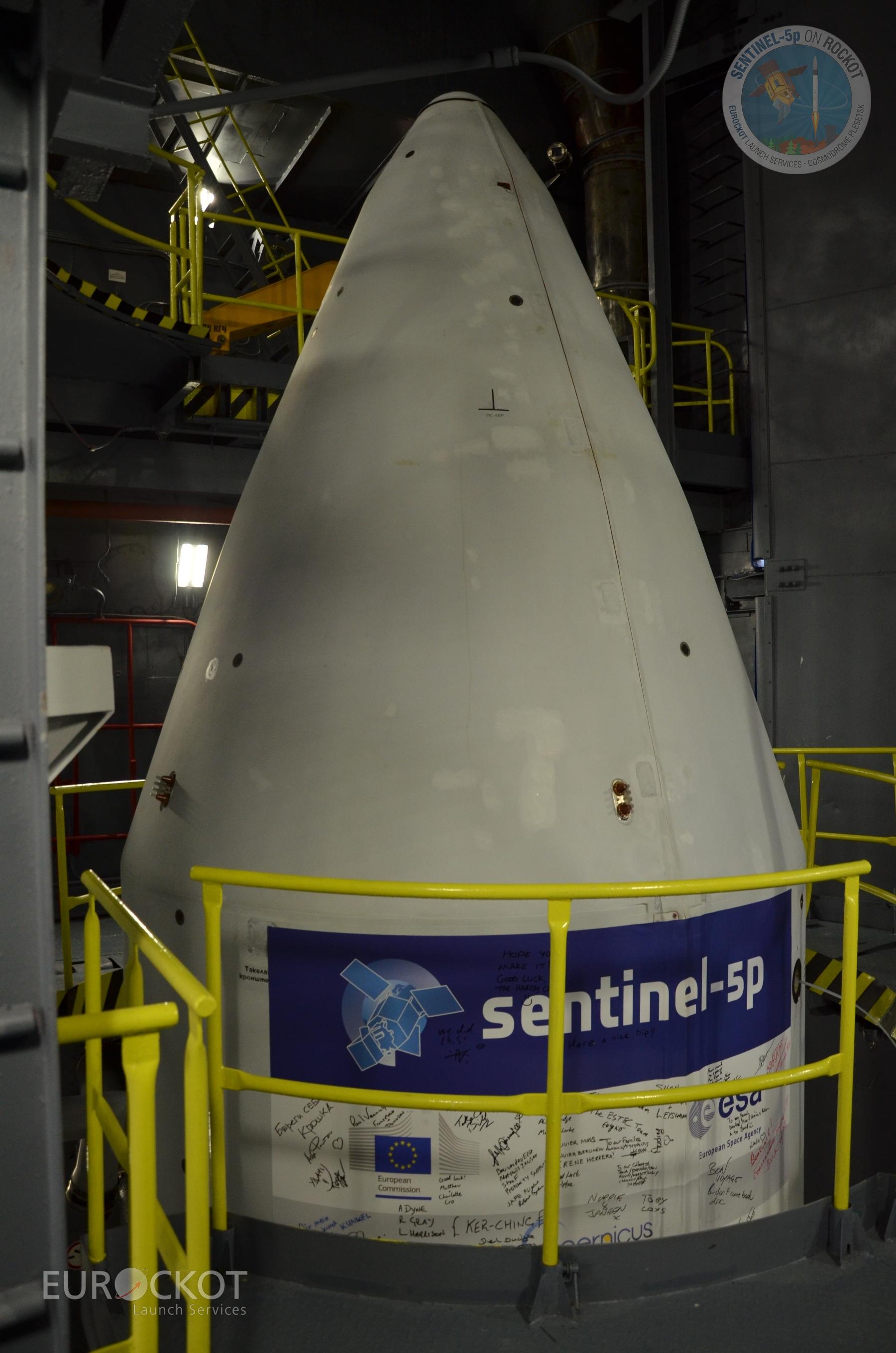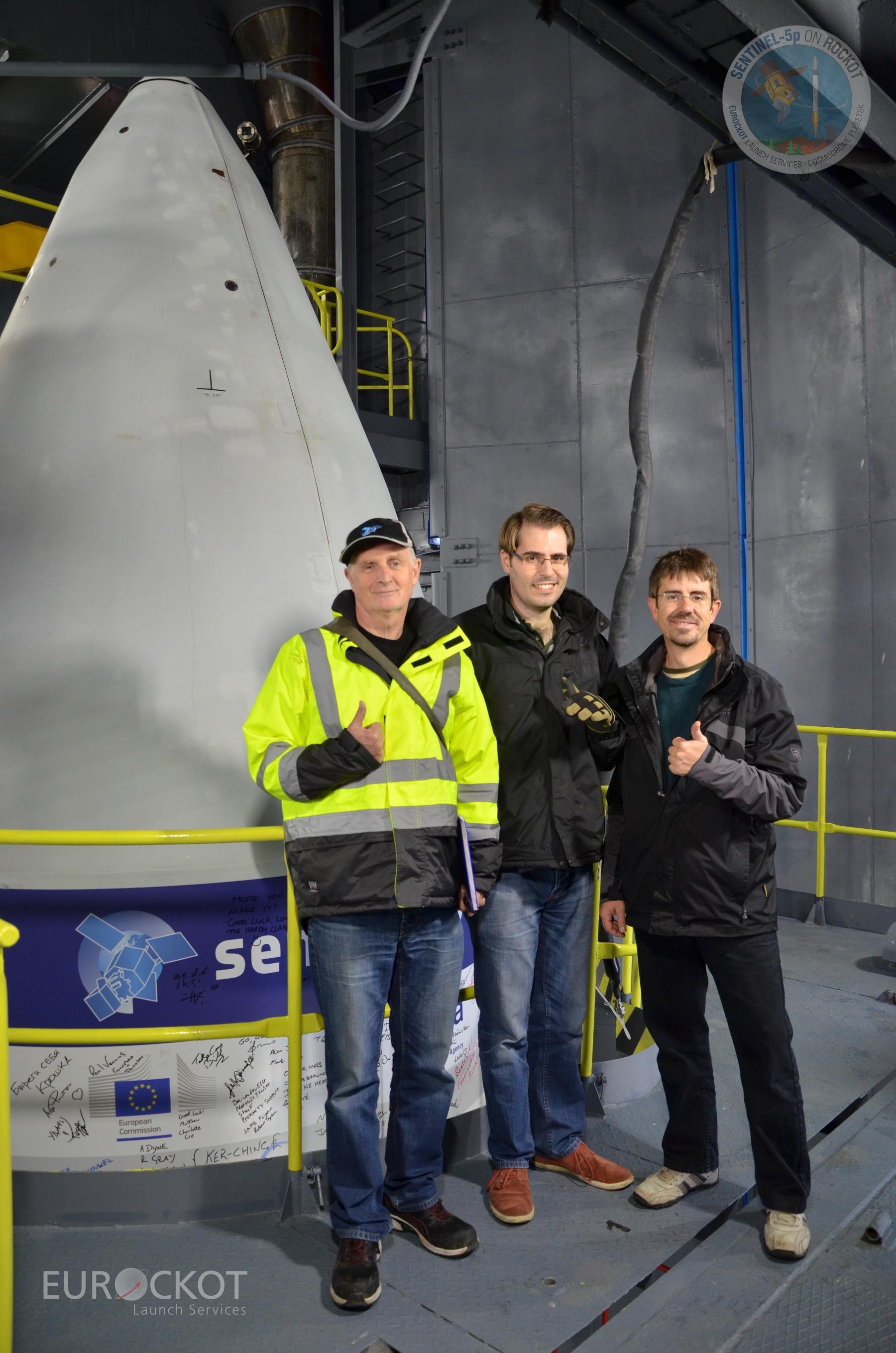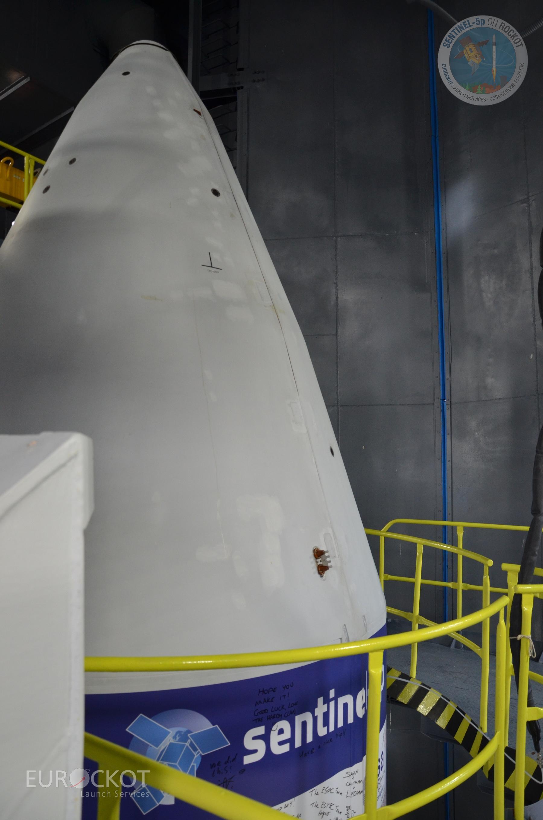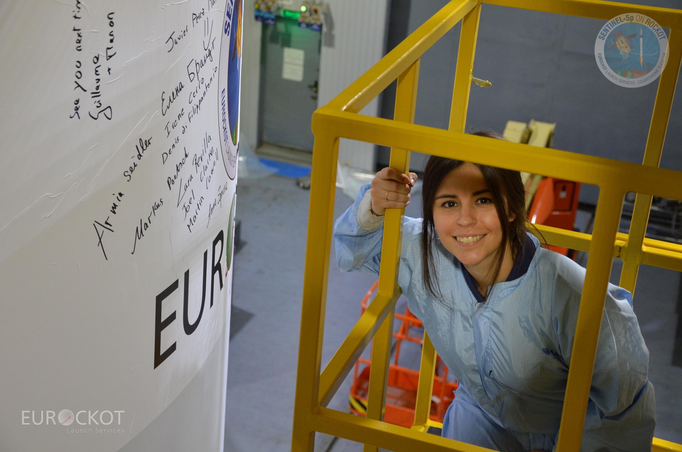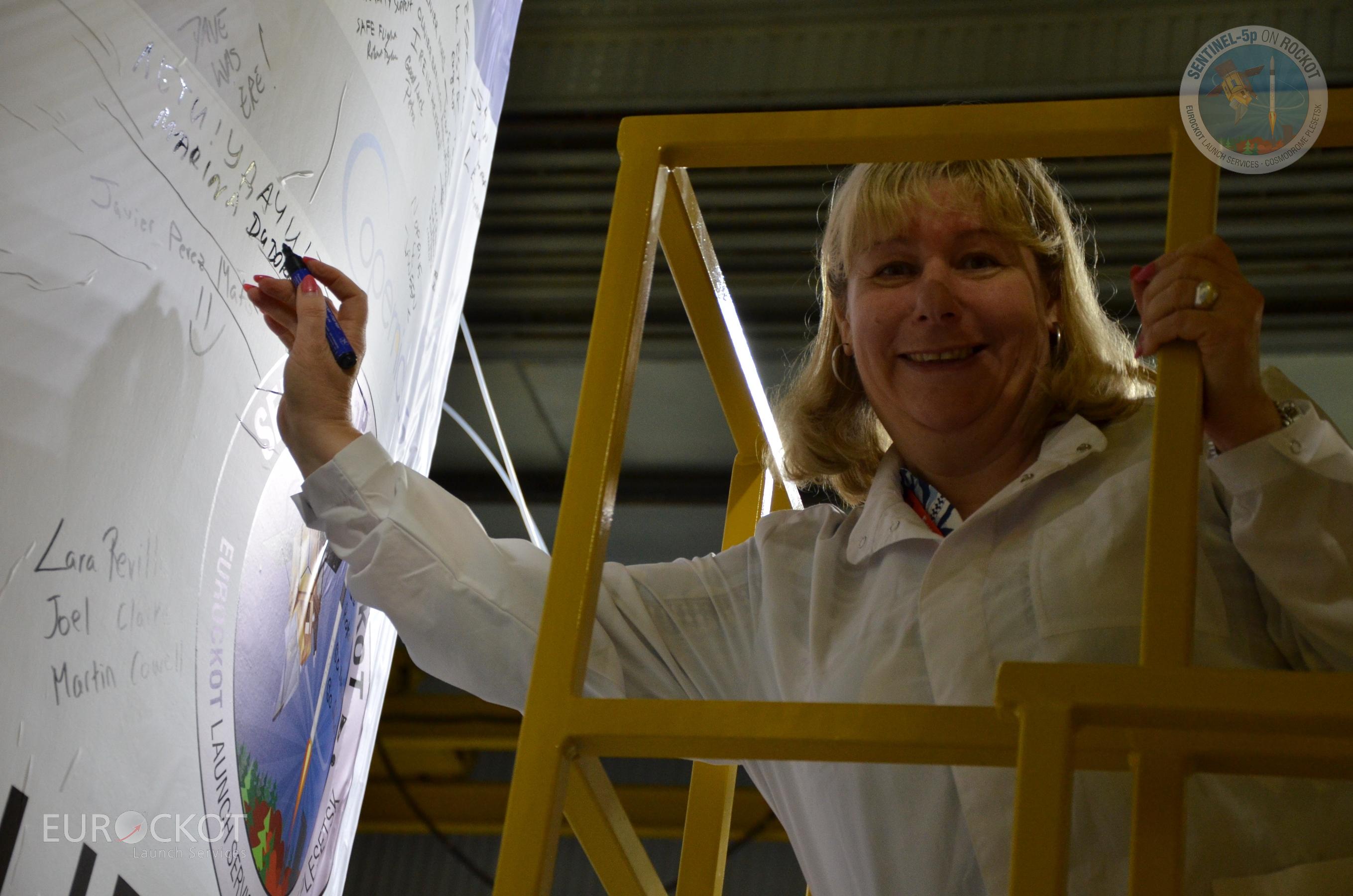 It is a nice tradition for Eurockot launches from the Plesetsk Cosmodrome: Once the payload fairing of the Rockot has been sealed, and after the mission logos have been attached, the entire launch campaign team gets the chance to sign their names on the rocket. Only eight days away from flight, the nose cone signing ceremony is a very emotional moment and many team members leave good wishes for mission success that will be carried into space. Sentinel-5p, enjoy the ride!