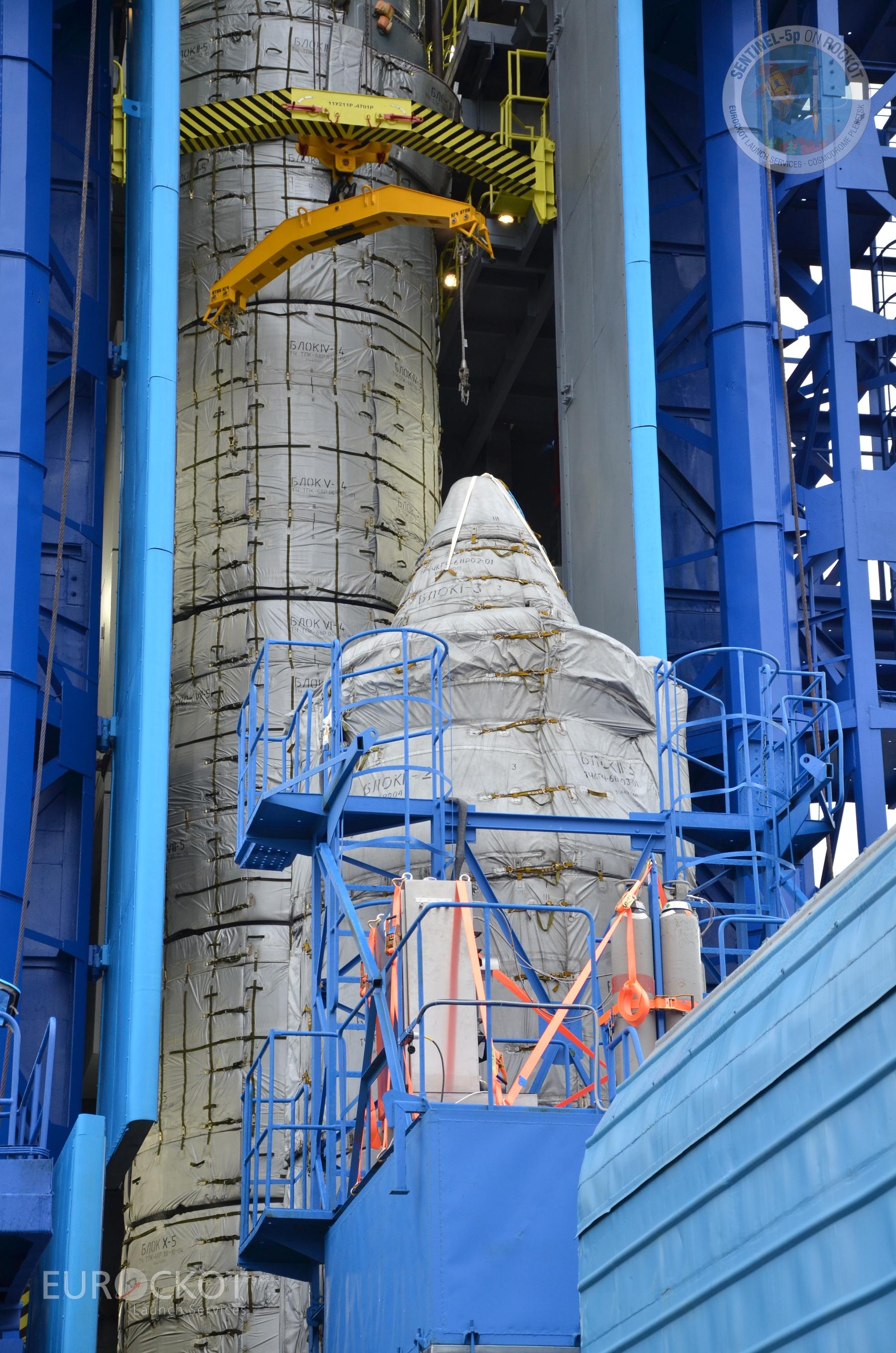 Arriving at the Cosmodrome's launch pad 14П25, the wrapped up Ascent Unit was lifted inside the service tower and lowered onto the Booster Unit. The Booster consists of the propulsion stages of the converted inter-continental ballistic missile SS-19 (Russian designation RS-18 ) and builds the first two stages of the civilian Rockot launcher.