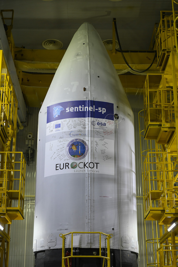 Europe's Sentinel 5P satellite, fitted with a Dutch-developed spectrometer to measure gases in Earth's atmosphere, was fueled and mated to its Russian Rockot booster over the last month at the Plesetsk Cosmodrome, a military complex around 500 miles (800 kilometers) north of Moscow.