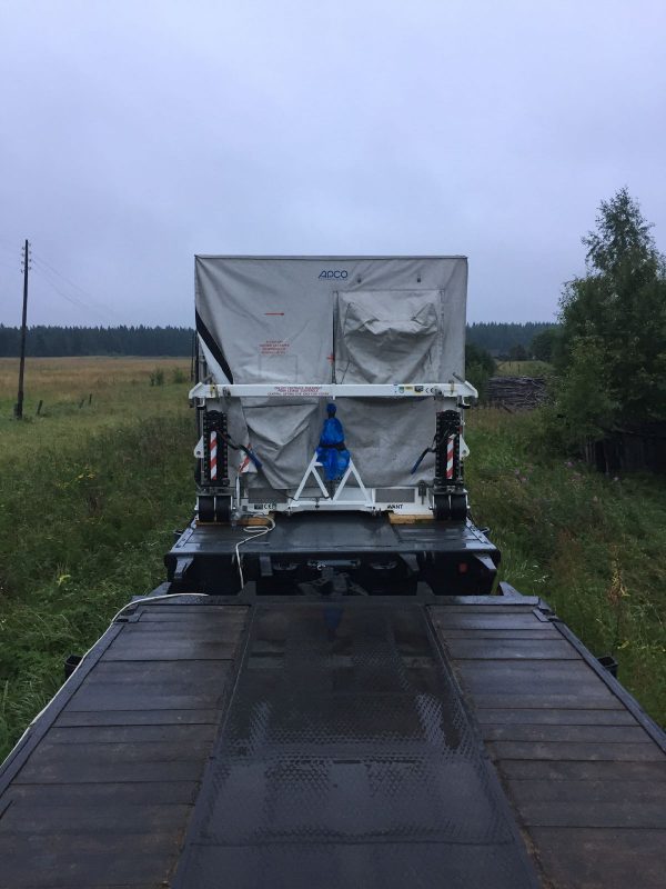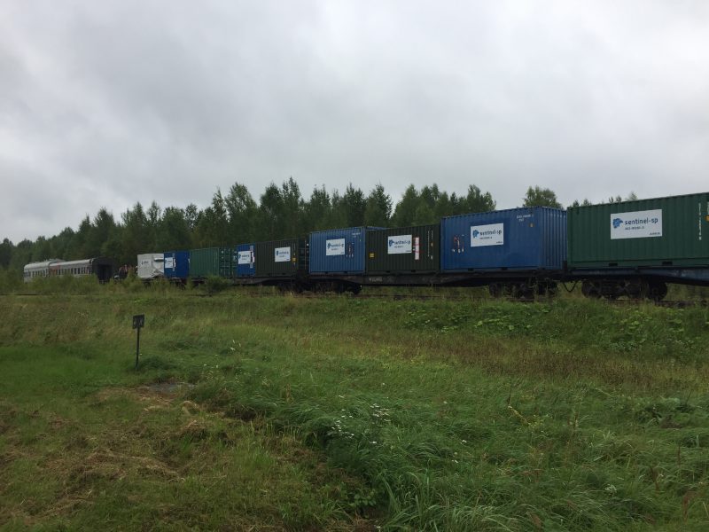 During the hours to follow, the complete cargo bay of the Antonov aircraft was re-loaded onto trucks for further transportation to Archangelsk rail yard – at minimum speed to protect the delicate freight. Once on the loading ramp, the containers housing the satellite and its engineering equipment were hoisted onto rail cars.