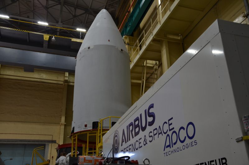 In parallel, the Payload Fairing (the two half-shells building the nose cone of the rocket encapsulating the Sentinel-5p satellite during ascent) was inspected and prepared for the so-called "dry run".