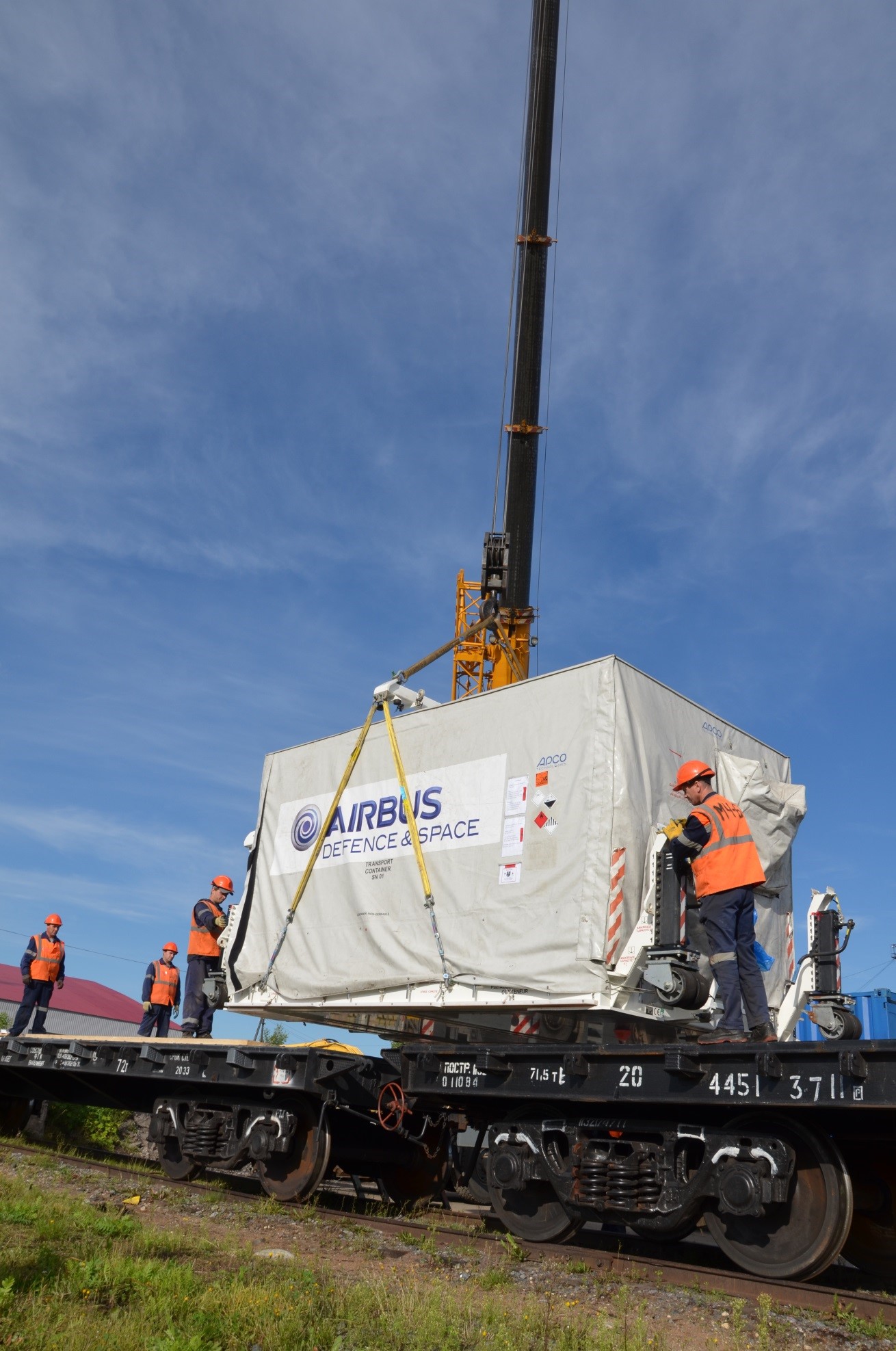 The precious cargo was taken fr om Airbus Defence and Space in Stevenage, UK, wh ere it was put together and tested, to London Stansted Airport to be loaded onto a huge Antonov plane for its flight to Moscow. This leg was followed by another flight to Arkhangelsk in northwest Russia and then a 250-km train journey to Plesetsk, arriving safe and sound on Friday 1 September.