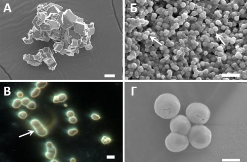 Наночастицы карбоната кальция, приготовленные in vitro в присутствии питательной среды, неотличимы от нанобактерий. Наночастицы готовили разведением 1:100 в питательной среде DMEM раствора 1М (NH4)2CO3 и 1M CaCl2. А. Если соли смешивать без добавления среды, то карбонат кальция образует пластинчатые кристаллы кальцита (входящего в состав обыкновенного мела) — сканирующая электронная микрофотография (СЭМ). Б. СЭМ наночастиц CaCO3, образующихся при использовании питательной среды. Наносферы по своей морфологии неотличимы от «контрольных» нанобактерий (ЧННБ); стрелками показаны «делящиеся» частицы. В. Тёмнопольная оптическая микроскопия наиболее крупных «представителей» CaCO3-частиц. Стрелкой показана форма, напоминающая череду последовательных делений клетки. Г. То же, по методу СЭМ.