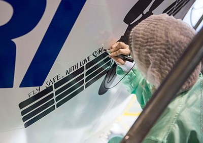One of the BRIsat satellite team members adds a personal touch to Ariane 5's protective payload fairing.