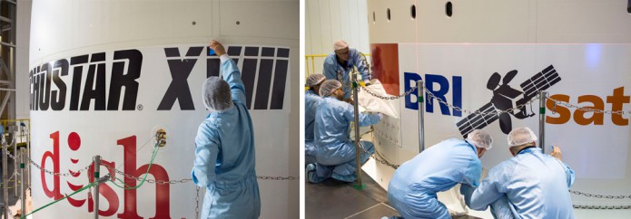 The placement of decals on Ariane 5's payload fairing for Flight VA230 is shown in this photo series. At left, the Echostar XVIII and DISH logos are positioned on the fairing's upper section, followed by the BRIsat logo under it (at right).