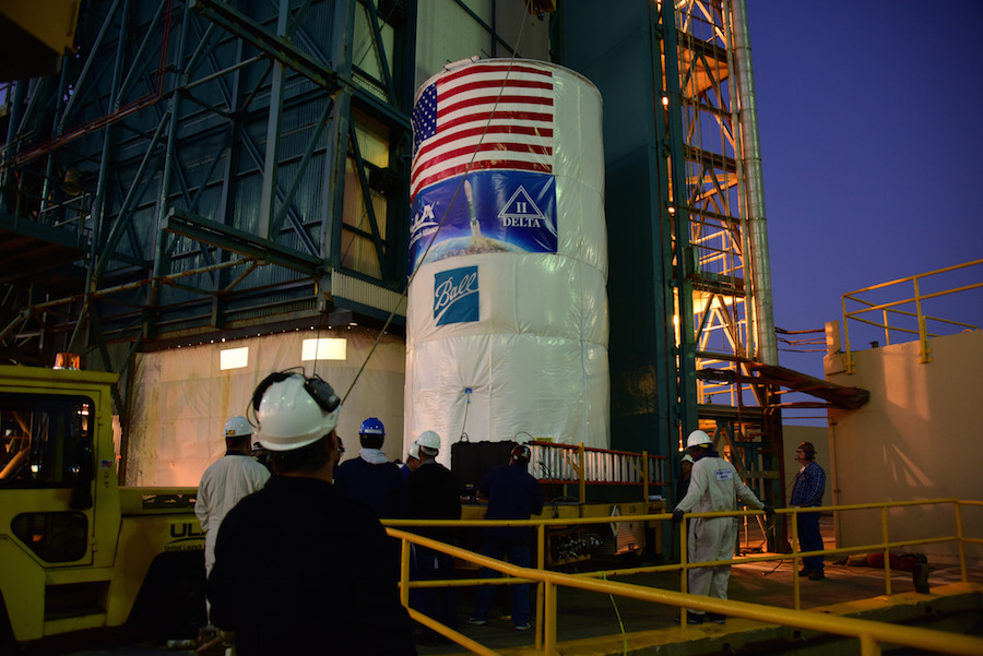 Packaged in a protective container, the Joint Polar Satellite System-1, or JPSS-1, spacecraft is about to be mated atop a United Launch Alliance Delta II rocket at Space Launch Complex 2 at Vandenberg Air Force Base in California. Built by Ball Aerospace and Technologies Corp. of Boulder, Colorado, JPSS is the first in a series four next-generation environmental satellites in a collaborative program between the NOAA and NASA. Liftoff is scheduled to take place fr om Vandenberg's Space Launch Complex 2. Photo credit: NASA/Billy Vinnedge