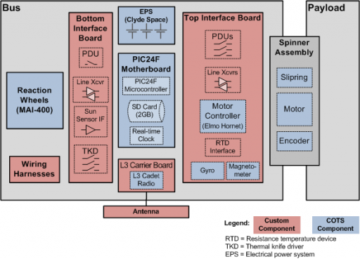 An 8-bit PIC microcontroller with extensive flight heritage serves as onboard computer and handles all payload operations as well as science board commanding. Power is generated by 28% Ultra-Triple-Junction solar cells with two cells in series per solar panel to deliver 4.7 V, 2 W from each board under full illumination. Four Li-Polymer batteries with a 4.4-Ah capacity at 7.4 V provide power storage. Attitude stabilization is accomplished with a simple solution using a permanent magnet to keep the satellite aligned with Earth's magnetic field.