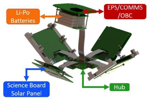 The MakerSat platform comprises a central Hub that interfaces with the four Science Boards which reside on the back of the four solar side panels with the Hub itself facilitated on the bottom panel and the combined EPS, Comms and Onboard Computer package on the topmost panel. The Hub hosts a microcontroller to build the central interface for all CubeSat subsystems and also facilitates an Inertial Measurement Unit to provide attitude data in addition to the solar cells on all outer panels that can be used to determine the solar vector. The solar boards include cut-outs for any external sensors of the payloads, e.g. cameras.