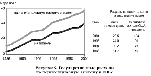 При всем при том расходы на содержание тюрем и других исправительных учреждений растут быстрее, чем расходы на медицину и образование. С 1986 по 2001 года они увеличились на 145%, с 15,6 до 38,2 млн. долларов (с учетом инфляции)4.