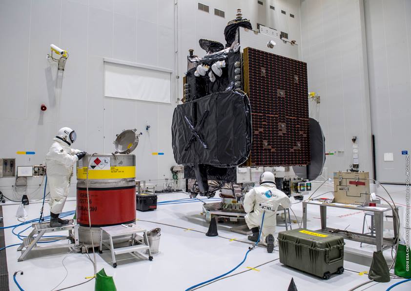 Technicians inside a clean room at the Guiana Space Center fuel the Hylas 4 satellite with its on-board propellant supply. Credit: ESA/CNES/Arianespace – Photo Optique Video du CSG – JM Guillon