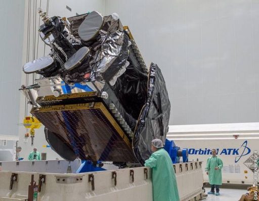 The 11,790-pound (5,348-kilogram) DSN 1/Superbird 8 spacecraft was supposed to launch on an Ariane 5 rocket in 2016, but the satellite was damaged during its transport to the launch base from Japan aboard a cargo plane. The satellite was returned to Japan for repairs.