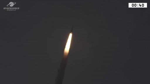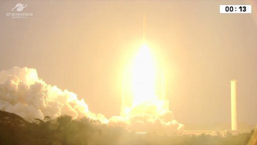 Ariane 5 blasted off fr om the edge of the Amazon at 21:34 UTC, 6:34 p.m. local time – just three minutes before sunset over the Atlantic-side launch pad. Riding into low-hanging clouds, Ariane 5 fired its boosters for the first two minutes and 15 seconds of the flight before they dropped away and the vehicle continued its express flight across the ocean powered by its cryogenic core stage alone. The 17-meter long fairing separated three and a half minutes into the flight and the second stage of the rocket took over at the nine-minute mark to complete the final boost into orbit, tasked with accelerating the satellites to nearly 9.5 Kilometers per second at the point of engine shutdown.