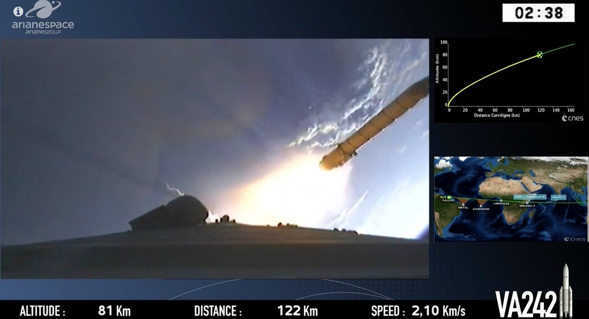 The heavy-lift workhorse delivered an estimated total lift performance of 10,260 kg. on today's flight, including the two passengers and hardware for its dual-payload deployment system. Designated VA242 in Arianespace's launcher family numbering system, this mission was the 242nd launch of an Ariane-series vehicle to date, as well as the 83rd Ariane 5 success since 2002.