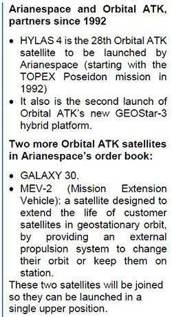 Arianespace has launched the entire operational fleet of British operator Avanti Communications. HYLAS 4 is the third satellite launched for this company by Arianespace, following HYLAS 1 (in November 2010) and HYLAS 2 (August 2012). The HYLAS 3 auxiliary payload, integrated in the EDRS-C satellite, will be launched as well by Ariane 5.