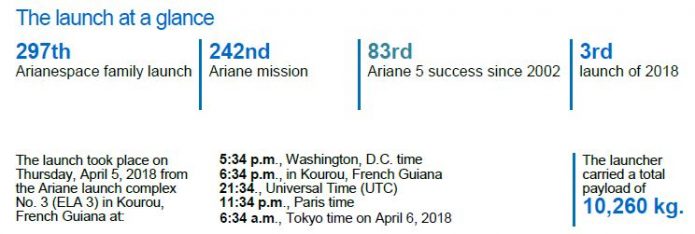 Arianespace's third launch of the year took place on Thursday, April 5, 2018 at 6:34 p.m. (local time) from the Guiana Space Center (CSG), Europe's Spaceport in French Guiana.