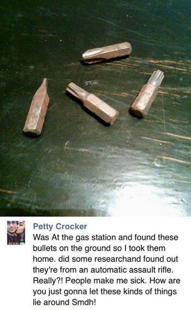«Была сегодня на заправке и нашла на земле эти пули. Забрала домой. После небольшого исследования я узнала, что это пули к автоматической штурмовой винтовке. Твою мать, это правда?! Я просто болею от такого! Как можно было эти штуки оставить просто так валяться на земле?!»