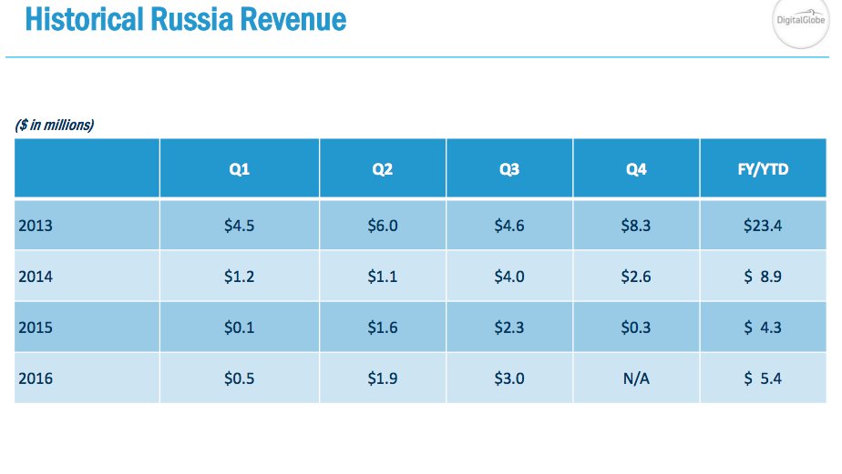 DigitalGlobe(2): Russia turnaround? Unclear, but 2016 revenue so far is up from 2015.