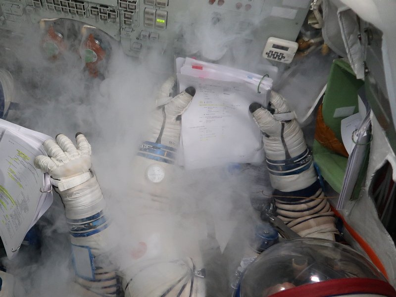 Where there's smoke, there's FIRE! Simulated Fire drill inside #Soyuz simulator. @Astro_Soichi @AstroMarshburn & @SergeyISS getting ready for #ISS exp 60/61 backup. #ソユーズ シミュレーターでの火災対処訓練。スモークマシン使ってリアルに煙充満させてます。