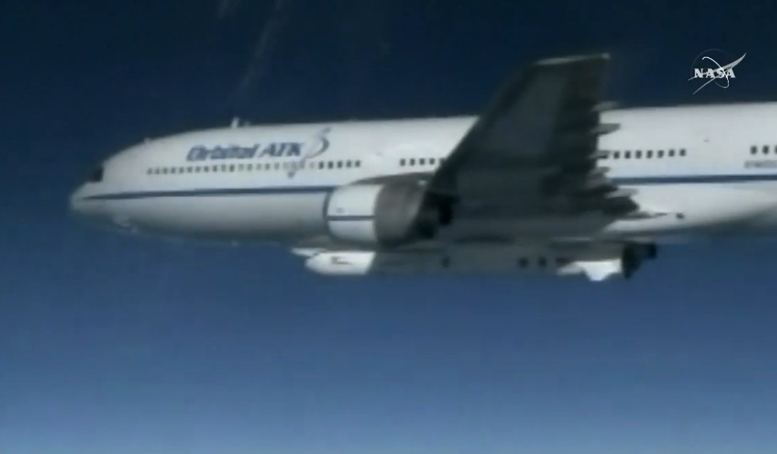 Meanwhile, the Pegasus rocket's avionics systems are going to internal power as the countdown ticks toward a drop targeted at 9:05:50 a.m. EST (1405:50 GMT).