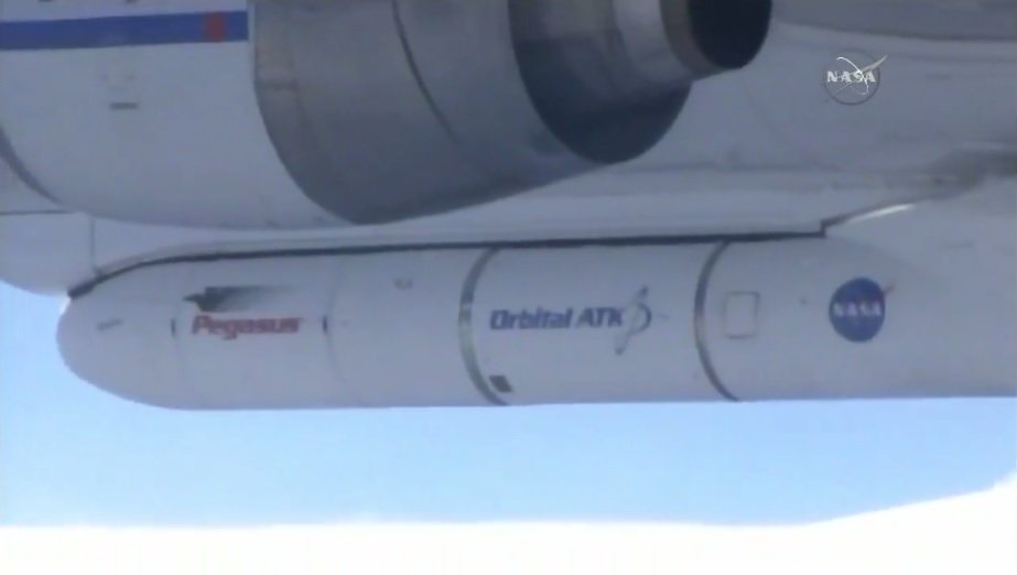 The Pegasus XL rocket was attached to the bottom of Orbital ATK's carrier plane Nov. 28 at Vandenberg Air Force Base in California.