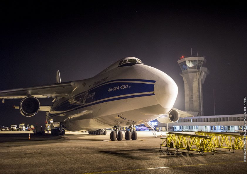 The protective container with Star One D1 emerges from the An-124 cargo jetliner during unloading activity at Félix Eboué International Airport near Cayenne.